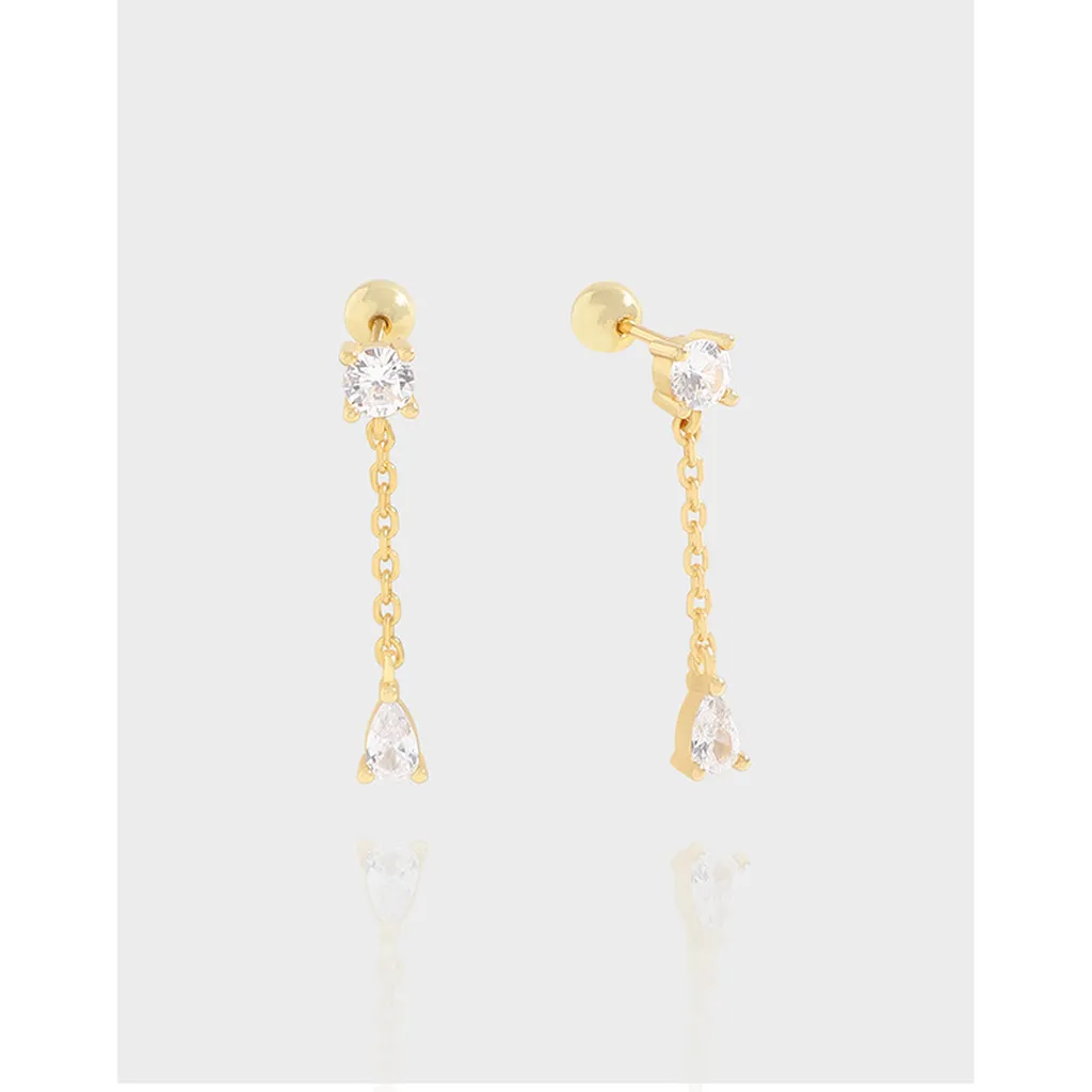 Style: A delicate balance of modern elegance and organic flow. These Emandra Earrings feature a secure stud-style post with a round brilliant-cut stone, from which a slender chain gracefully dangles, culminating in a captivating pear-shaped stone. This fluid design evokes the ever-changing brilliance of celestial phenomena, offering a sophisticated yet effortless charm.