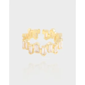 • Modern Geometric Design: This Emarith Ring features a unique, modern aesthetic, characterized by an irregular arrangement of baguette-cut crystals. The stones are set in an offset, zigzag pattern that creates an intriguing, abstract flow around the band.