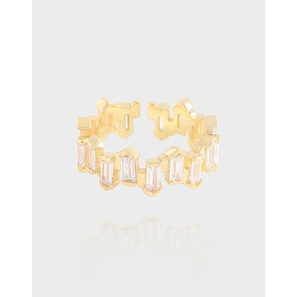 - Modern Geometric Design: This Emarith Ring features a unique, modern aesthetic, characterized by an irregular arrangement of baguette-cut crystals. The stones are set in an offset, zigzag pattern that creates an intriguing, abstract flow around the band.