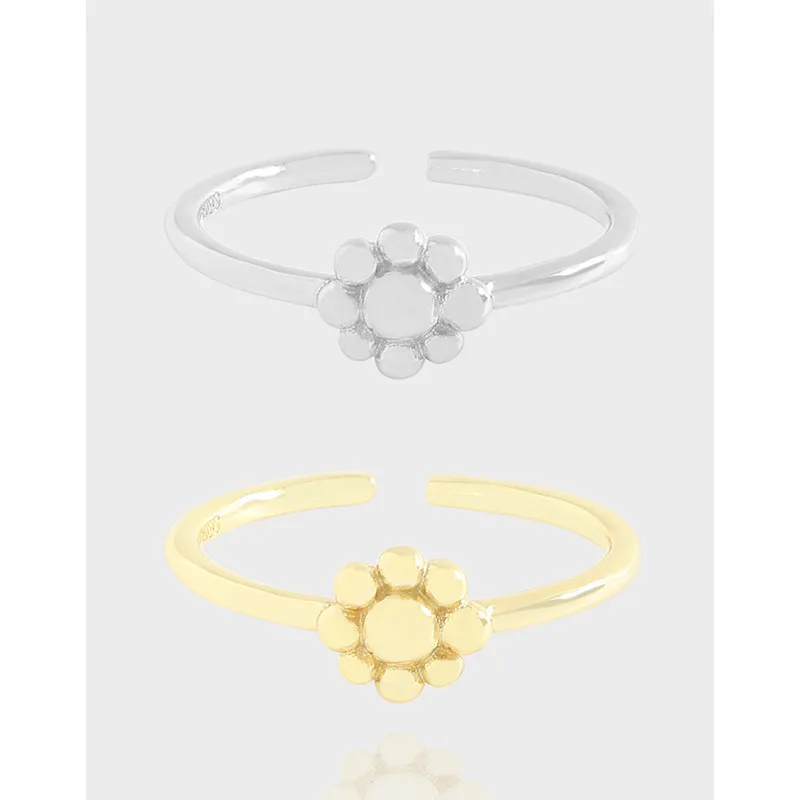 The centerpiece features a sweet, minimalist floral motif, intricately formed by a central rounded element encircled by six smooth, petal-like shapes. The entire Embera Ring showcases a polished, reflective finish, enhancing its subtle elegance.