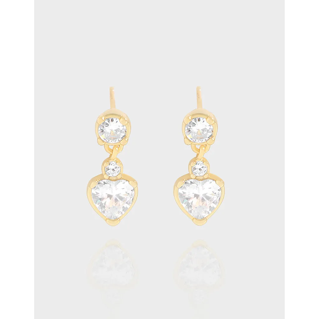 - Style: An elegant dangle design, these earrings feature a sequence of sparkling stones: a round stud, a smaller accent stone, and a prominent heart-shaped drop, creating a romantic and sophisticated look.