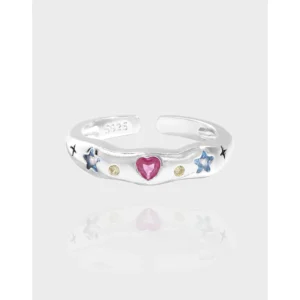 • Color: The lustrous silver band sets the stage for a captivating palette. A vibrant pink heart gemstone is centered, flanked by two celestial blue star gemstones and two subtle golden yellow round gemstones.