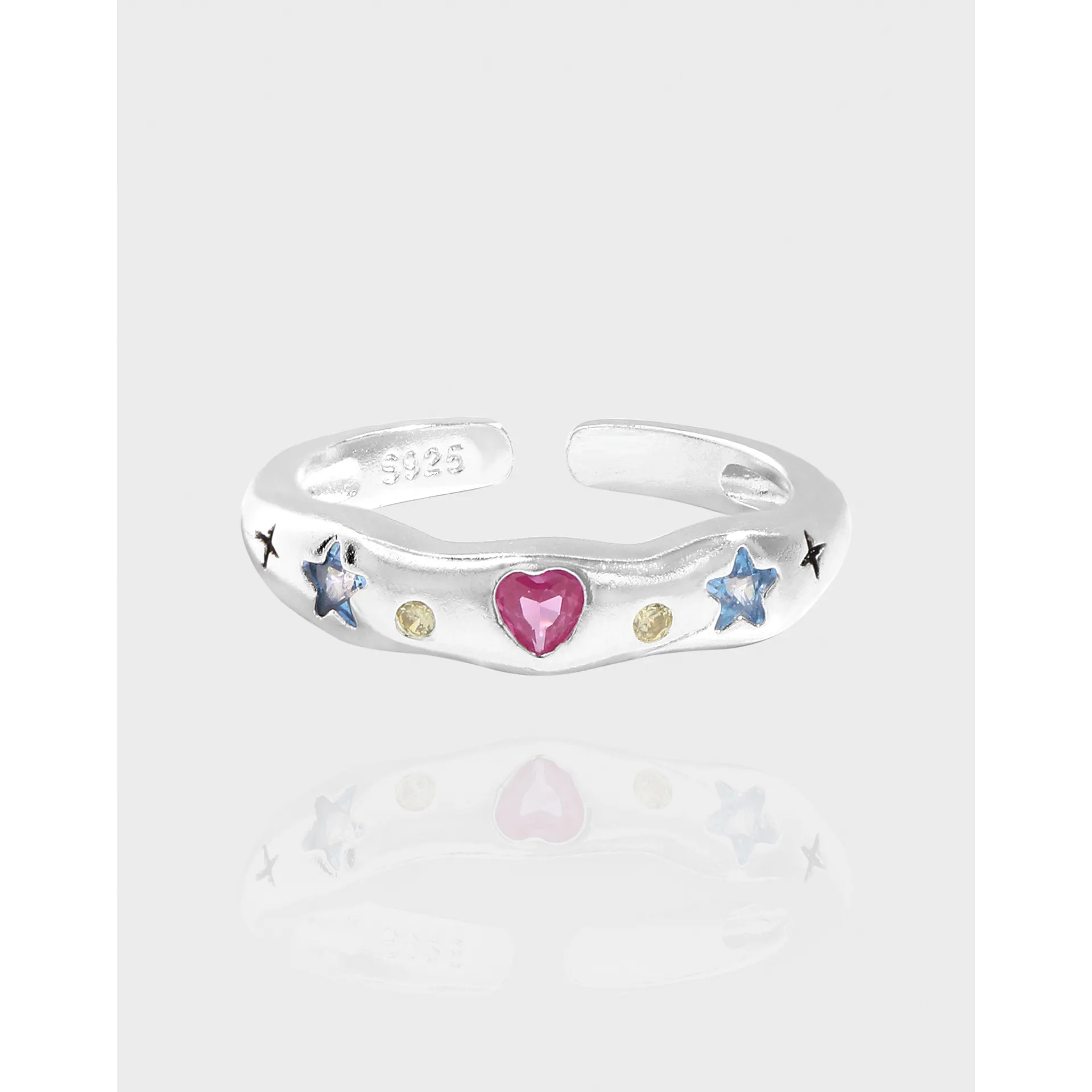 • Patterns & Textures: The band boasts a smooth, polished finish, subtly contoured to resemble nature’s fluid shapes. Each gemstone, including the heart, stars, and round accents, is faceted to catch the light. Discreet etched motifs, like tiny starbursts, provide a touch of raw texture, and the ‘S925’ mark signifies its sterling silver quality.