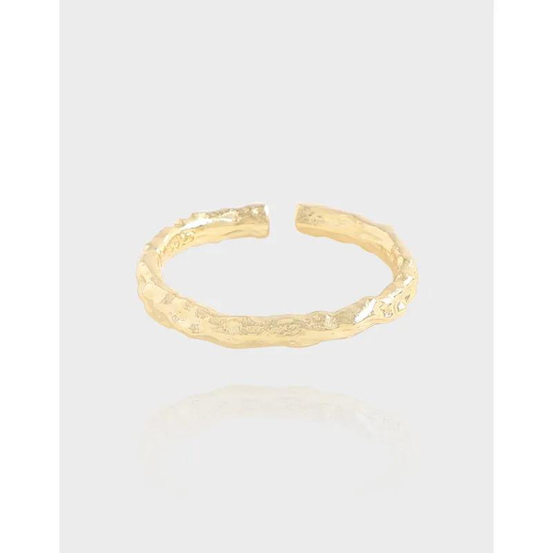- Patterns or Textures: Featuring a captivating hand-hammered and undulated surface, the ring boasts a raw, imperfectly beautiful texture that mirrors the unique patterns found in nature’s elements.