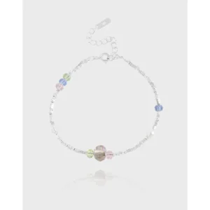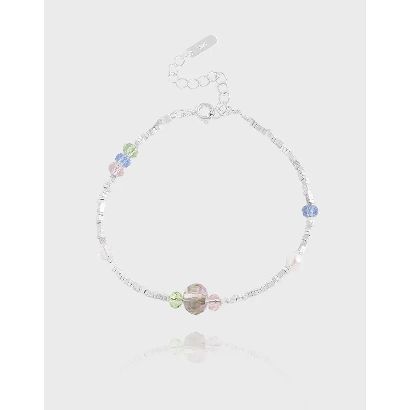 - Color: The Erilina Bracelet features a shimmering strand of tiny silver-toned beads, adorned with a constellation of pastel-hued faceted crystals in soft green, delicate blue, and gentle pink. A luminous iridescent crystal takes center stage, flanked by additional pastel beads, and a single lustrous white pearl adds a touch of classic elegance.