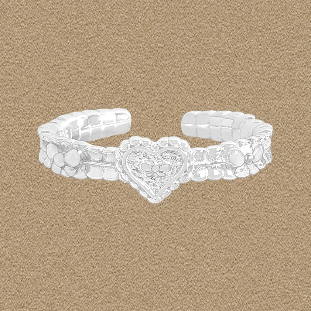 - Patterns & Textures: The central feature is a charming heart, its surface alive with raw, stippled textures and adorned with a delicate, four-petal floral motif – an embodiment of nature’s imperfect beauty. The band showcases a delicate balance of textures, with one side featuring organic, pebble-like shapes and the other a scalloped edge detailed with subtle raised dots, creating a graceful flow.