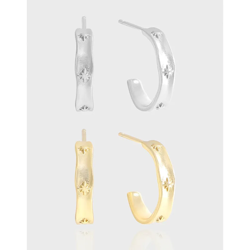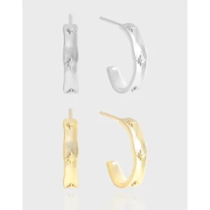 • Patterns & Textures: Each hoop features a uniquely textured surface, creating subtle depth and a raw, natural feel. Intricately engraved starburst patterns adorn the surface, evoking the shimmering night sky and telling a story of mystery and cosmic allure.