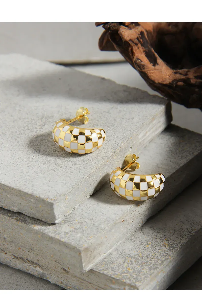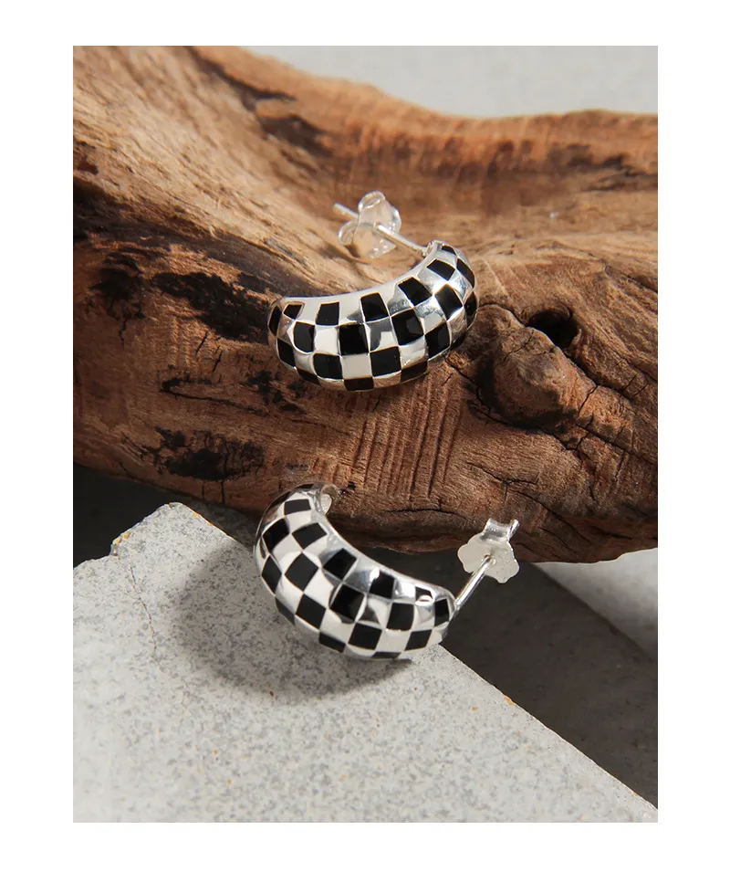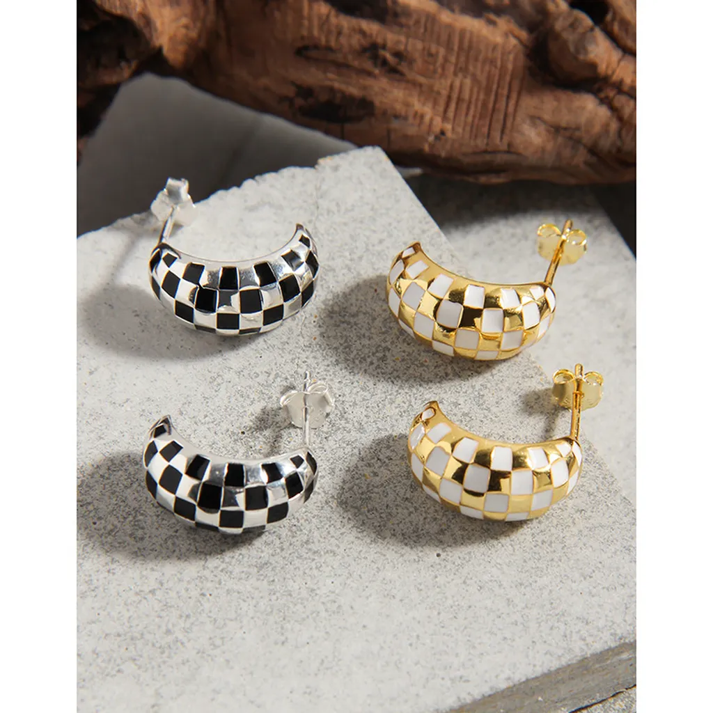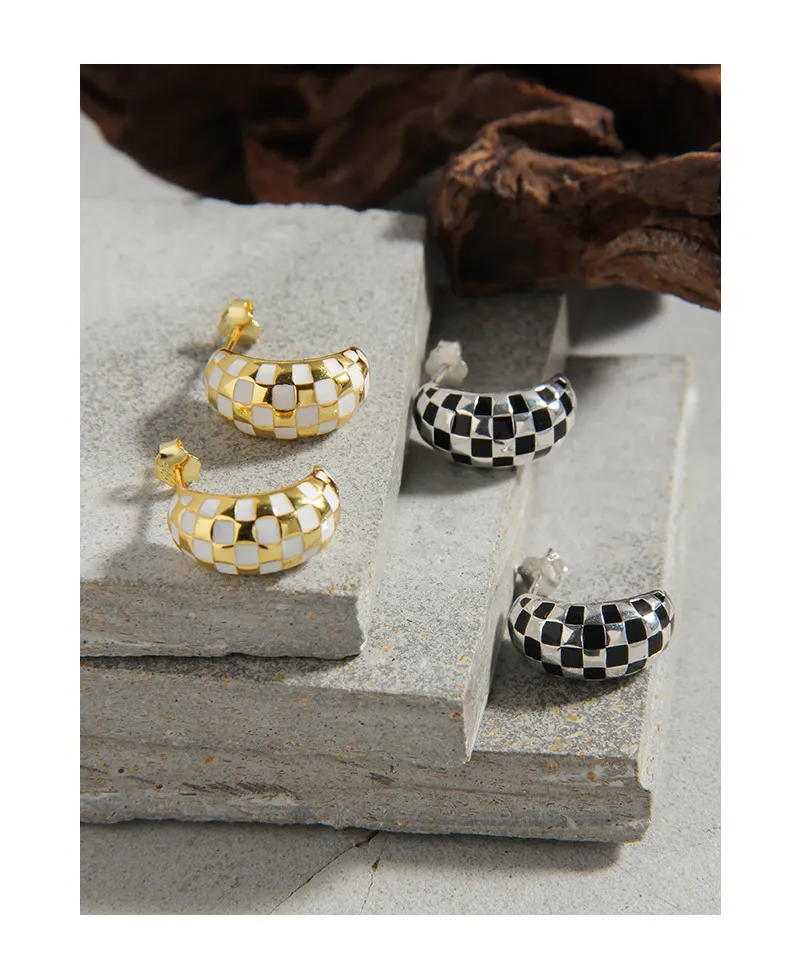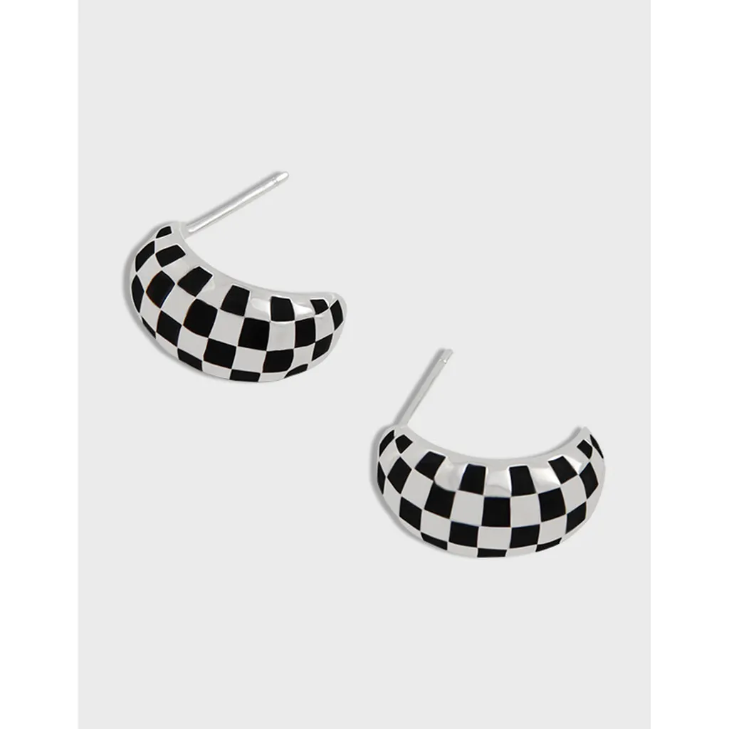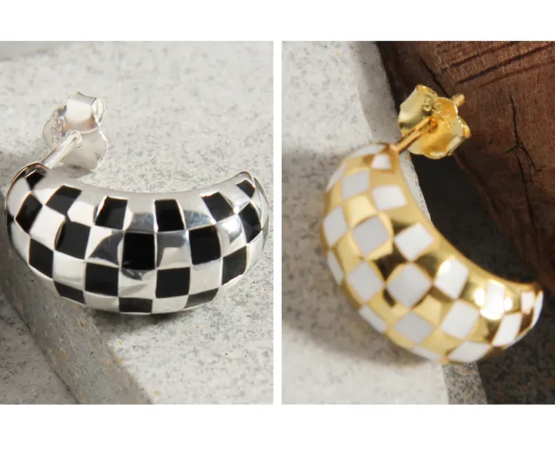 • Color: These eye-catching Esilithra Earrings feature a striking monochromatic palette, showcasing a bold black and white checkerboard pattern. The contrast between the crisp black and bright white squares creates a visually dynamic effect.