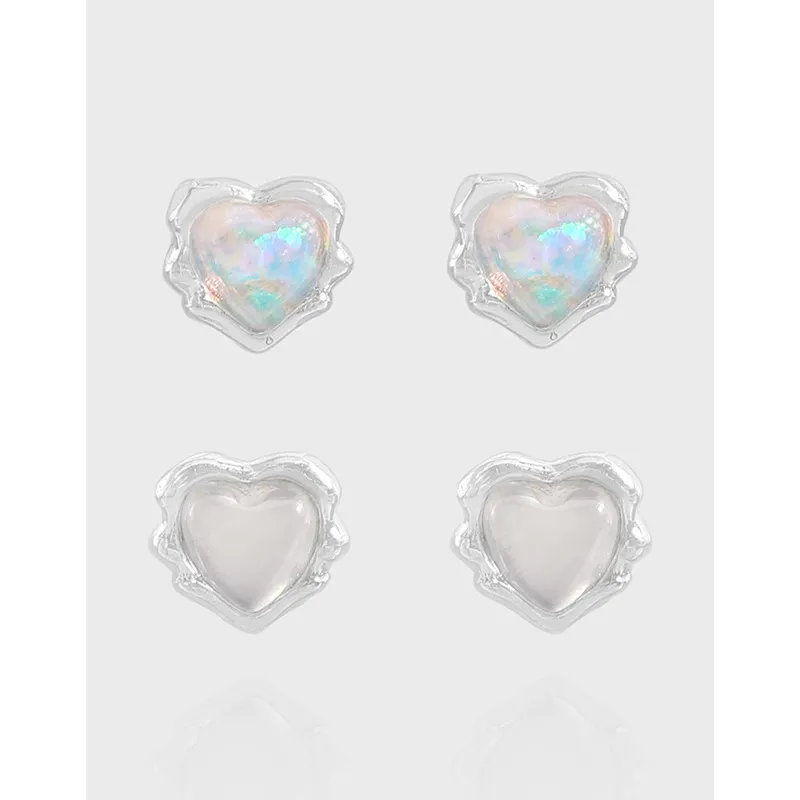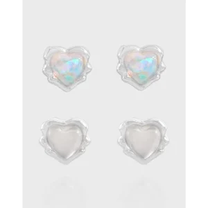 - Color & Iridescence: The first pair features an exquisite heart imbued with an ethereal, aurora-like iridescence. Its polished surface shimmers with a spectrum of soft, shifting hues, reminiscent of the Northern Lights. The second pair showcases a serene, opaque milky white heart, evoking the gentle glow of a full moon. Both are beautifully framed by a lustrous silver-toned border.