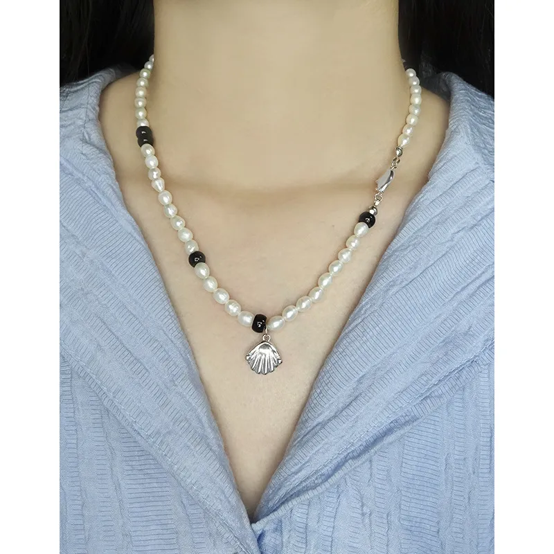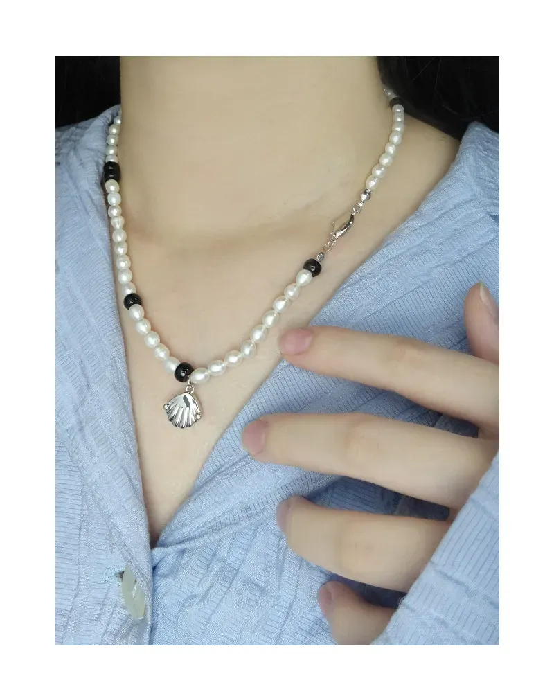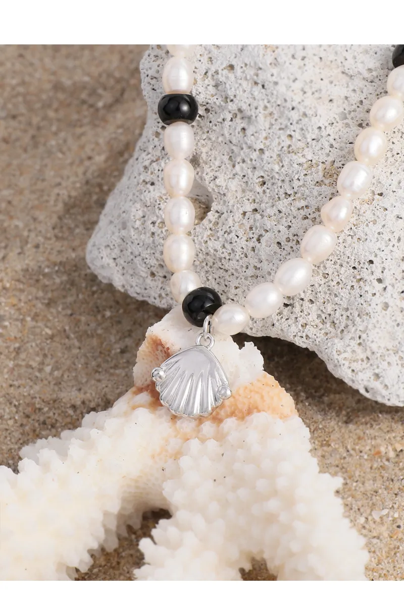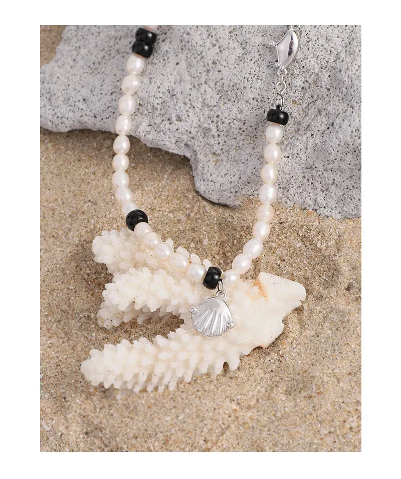 - Patterns & Textures: Each pearl showcases its natural, slightly irregular shape and soft, iridescent luster, reflecting the organic beauty of nature. Smooth, polished black beads intersperse the pearls, providing a sleek texture. The silver-toned shell pendant features subtle, refined fluting, adding an intricate textural detail, complemented by the smooth, reflective finish of the metal components.