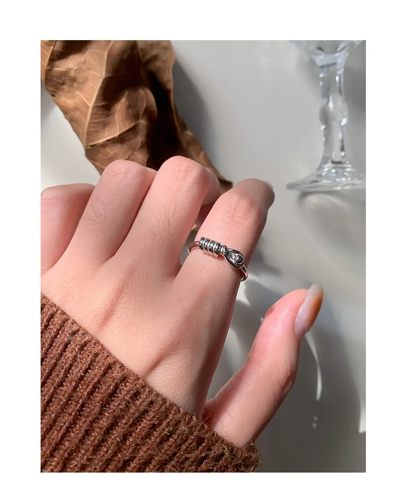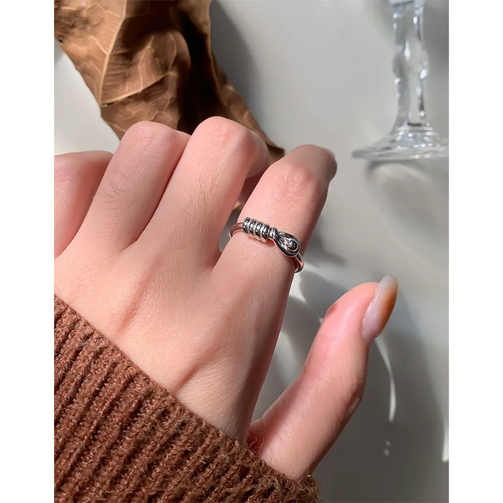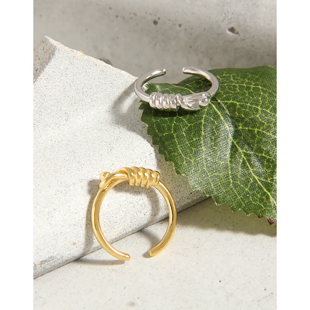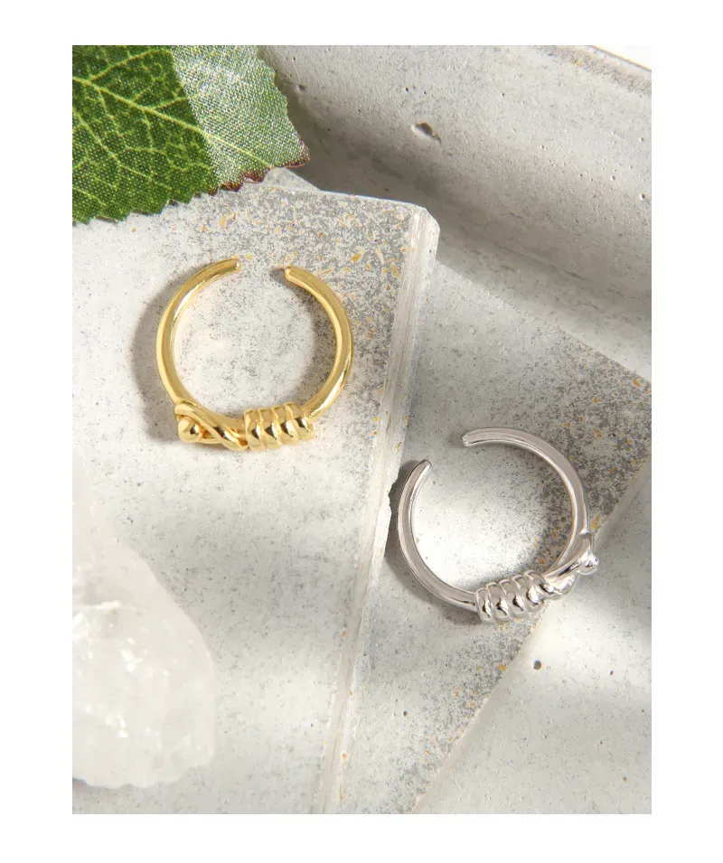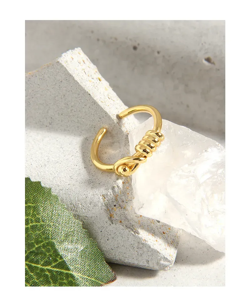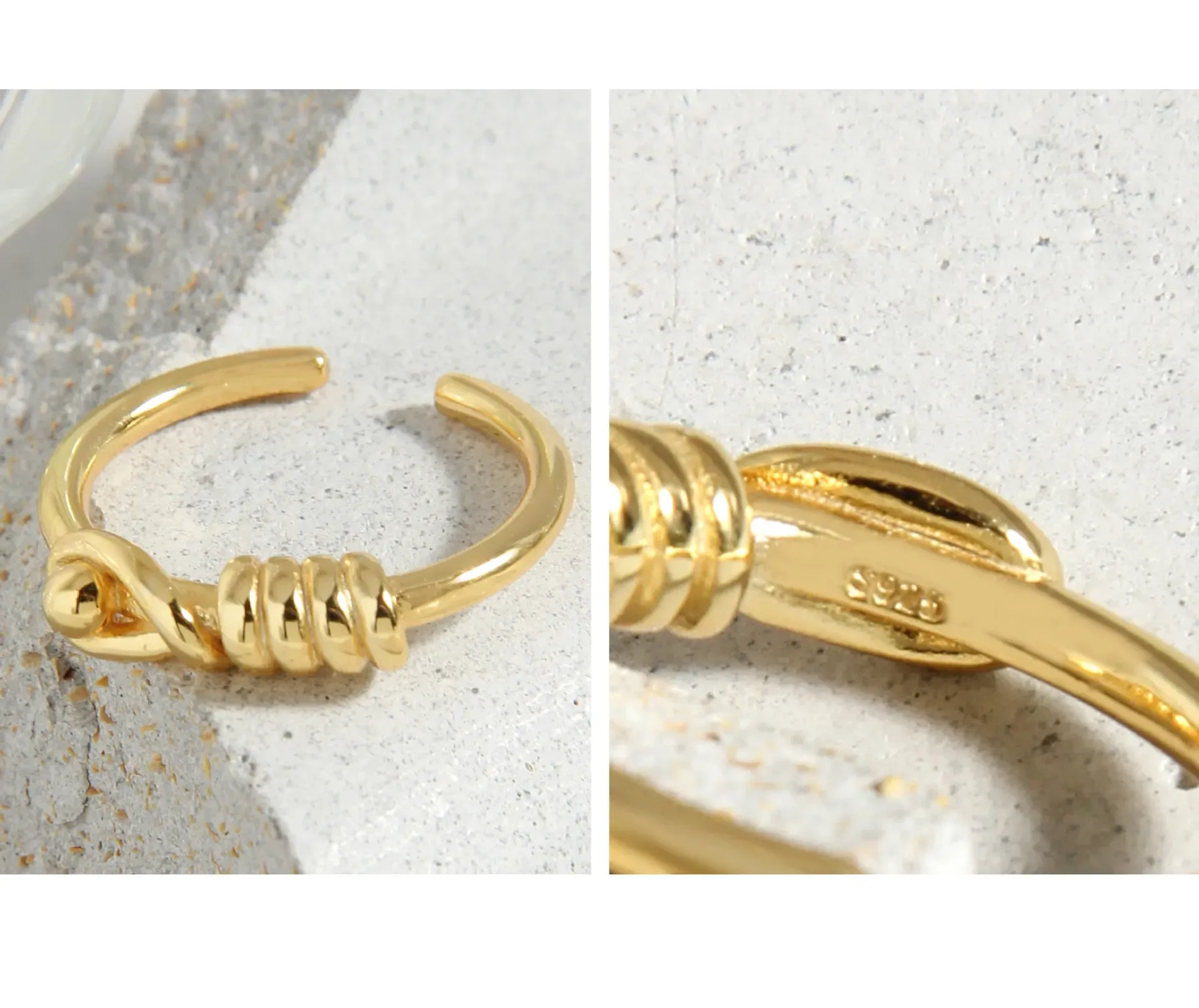 Patterns & Textures: The ring showcases unique details – one side features a series of intricately wrapped bands, creating a subtle, tactile texture that echoes the layered formations found in the wild. The opposing side is adorned with a sculptural knot, symbolizing connection and the imperfect, yet beautiful, patterns of nature’s artistry. The smooth, polished sections of the band provide a striking contrast, highlighting these raw textures and fluid shapes.