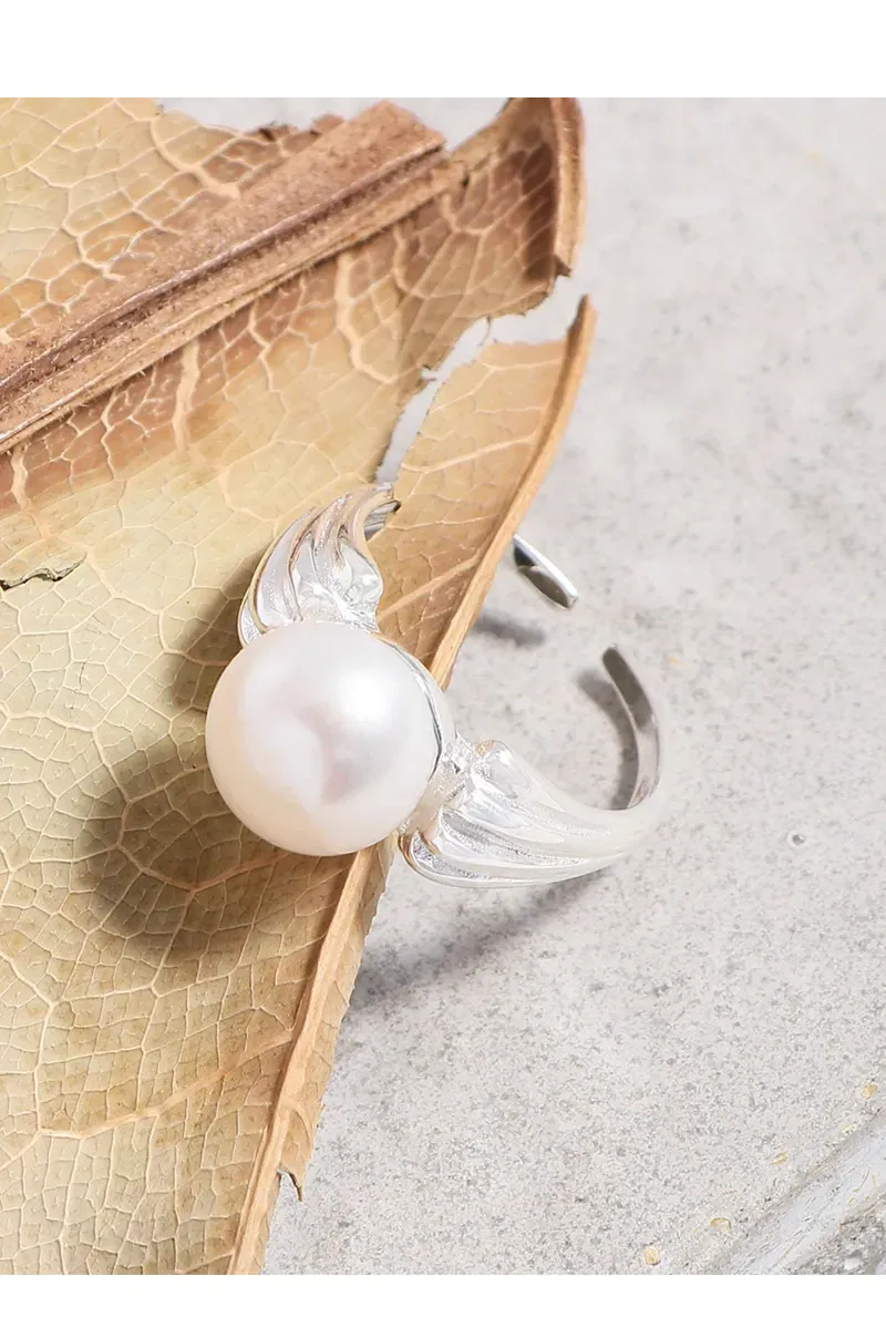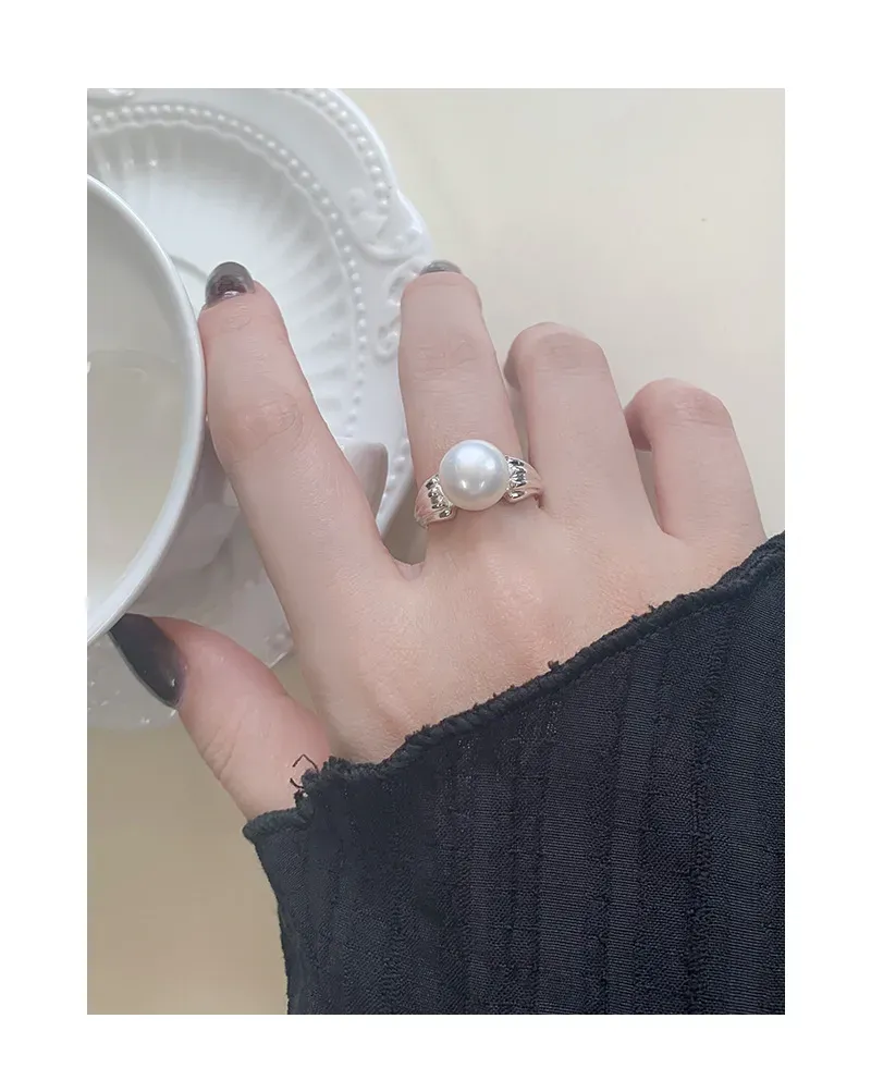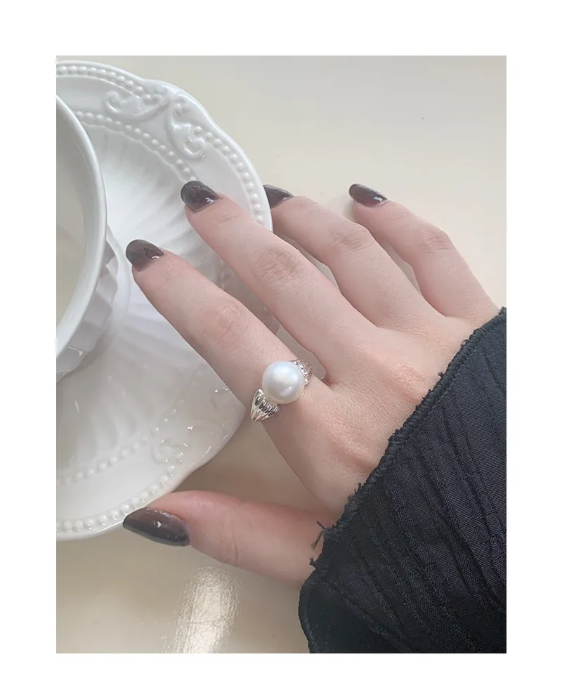 This captivating ring features a lustrous, spherical white pearl at its center, exhibiting a delicate iridescence that catches the light beautifully.