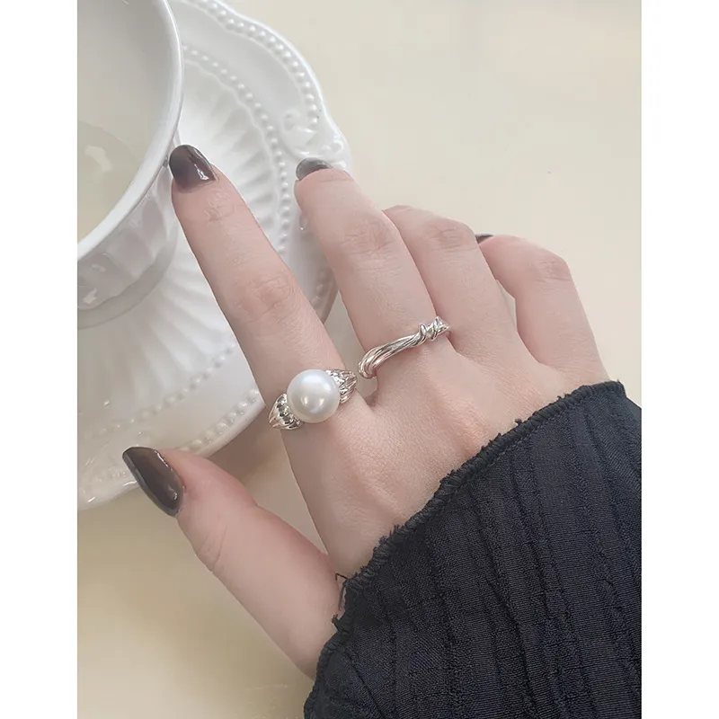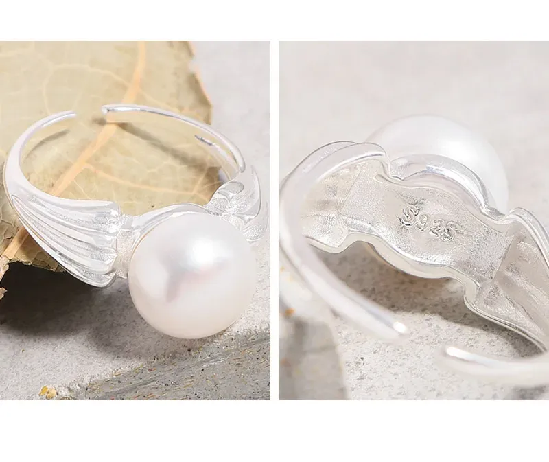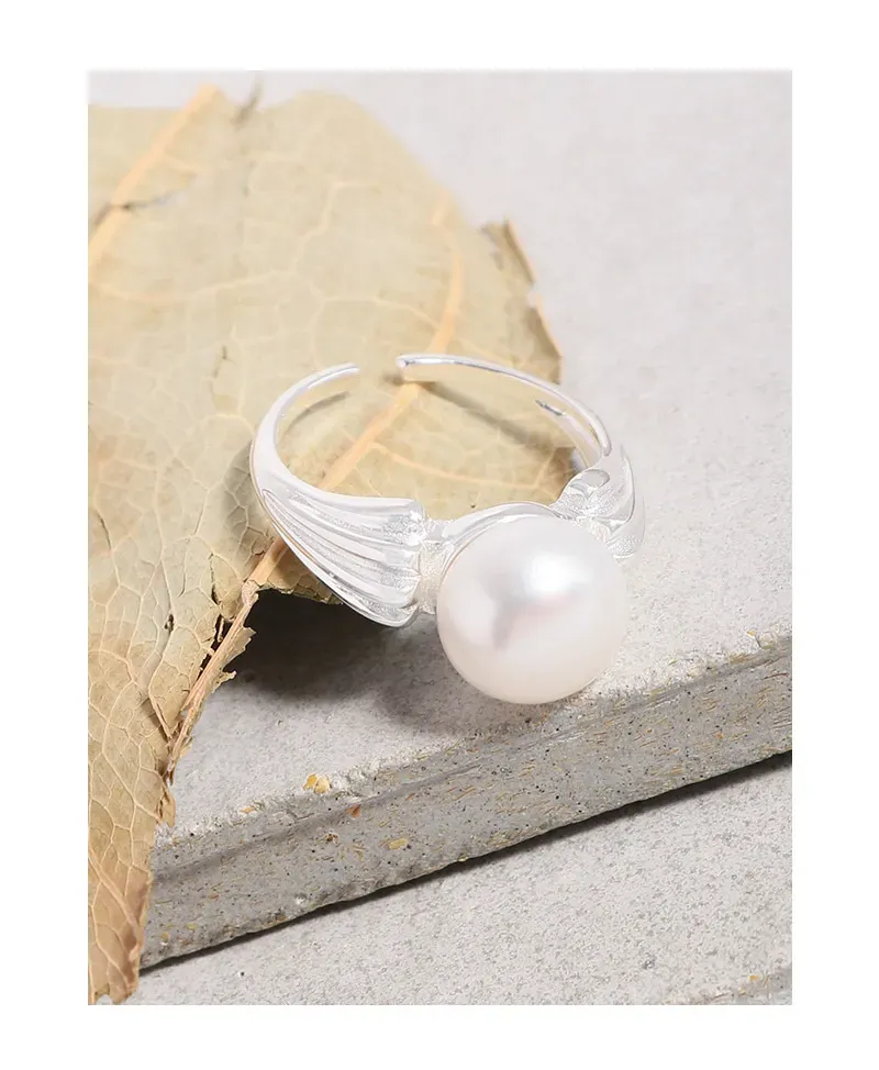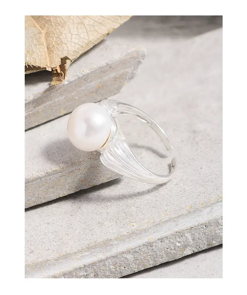 The design is accentuated by unique patterns on either side of the pearl; the silver band is intricately detailed with elegant ribbed grooves, creating a textured, organic appearance reminiscent of delicate waves or a shell’s embrace. The central pearl itself presents a flawlessly smooth and radiant surface.