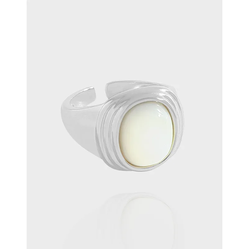 - Color: The band shines with the bright, cool luminosity of polished sterling silver. It perfectly complements the central, radiant milky white cabochon stone, which evokes the gentle shimmer of moonlight or the deep luster of a pearl.