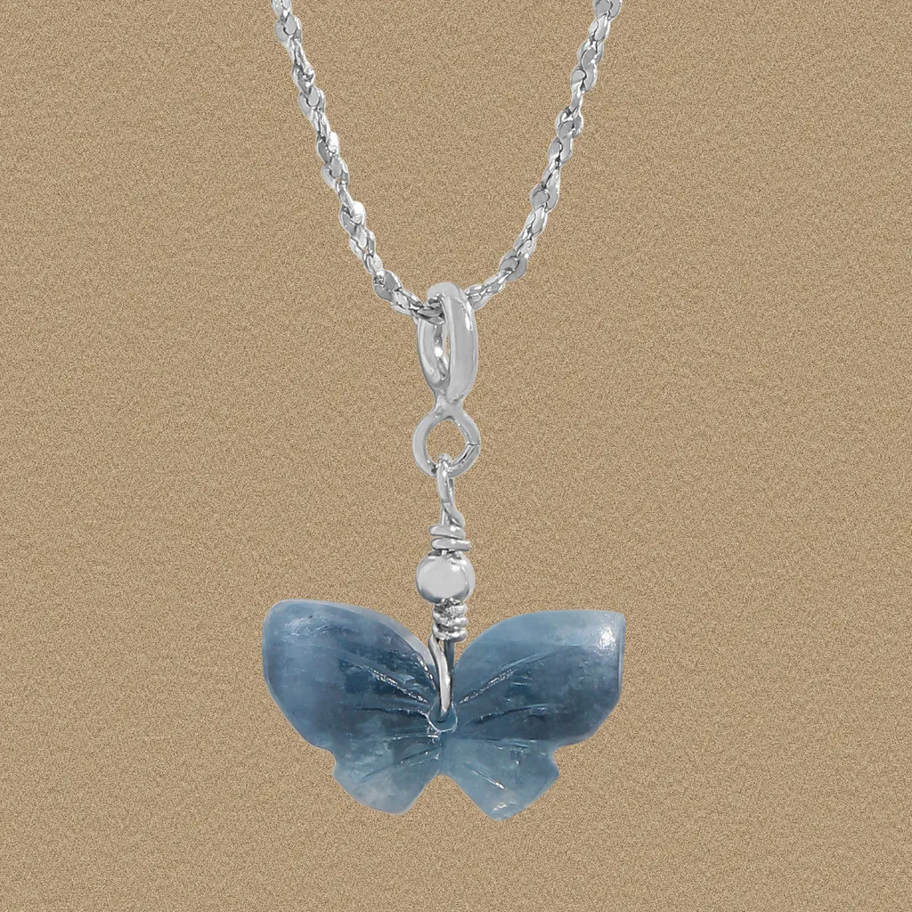 Color: The captivating centerpiece is a translucent, pale blue butterfly, evoking the serene hues of natural aquamarine. This delicate gemstone is beautifully complemented by the gleaming silver-tone chain and polished silver hardware.