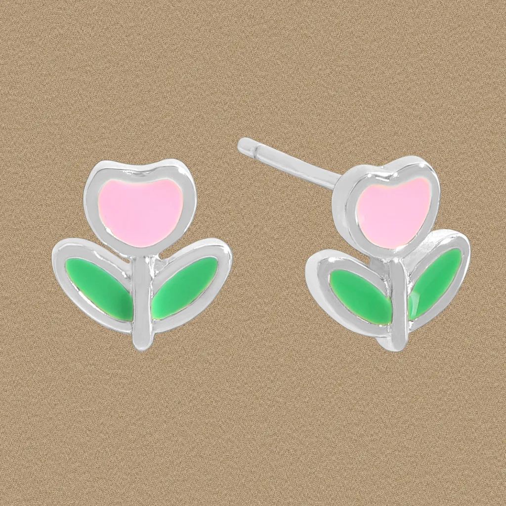 • Patterns or Textures: The design showcases smooth, glossy enamel infill for both the pink petals and green leaves, giving them a vibrant, polished finish. The silver-tone metal frame and stem are equally smooth and reflective, highlighting the clean, stylized floral pattern.