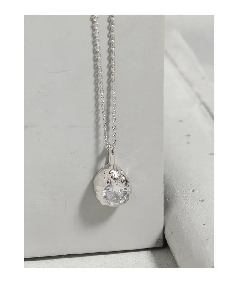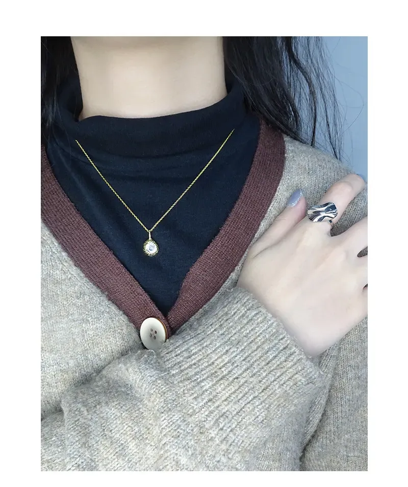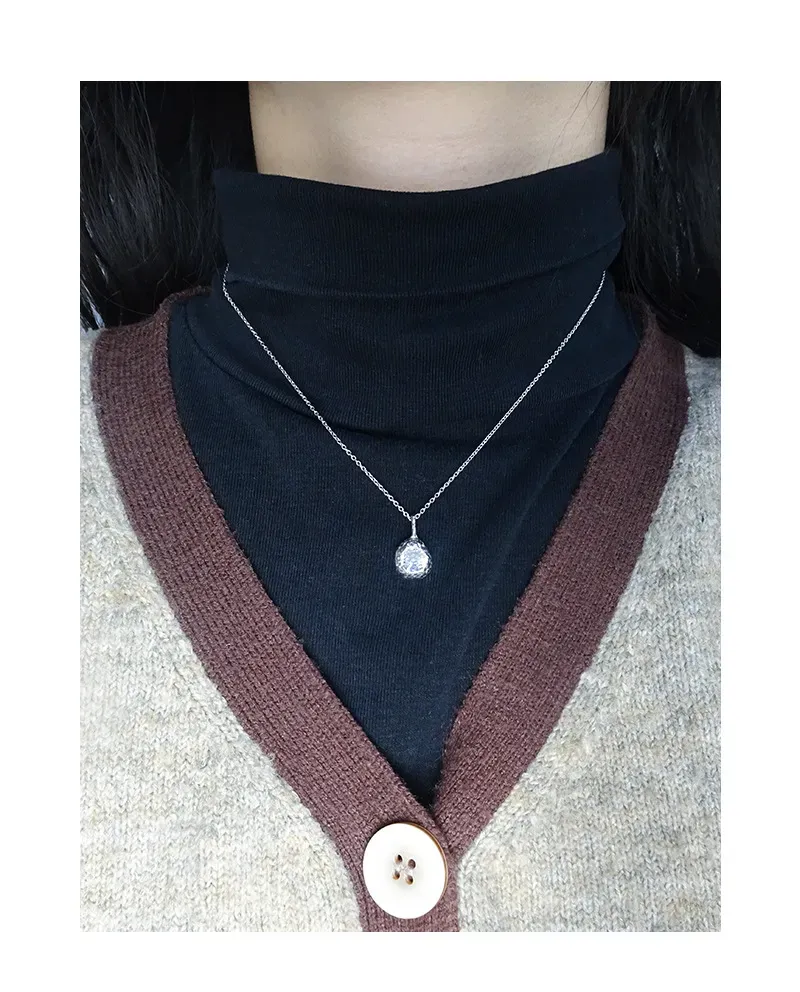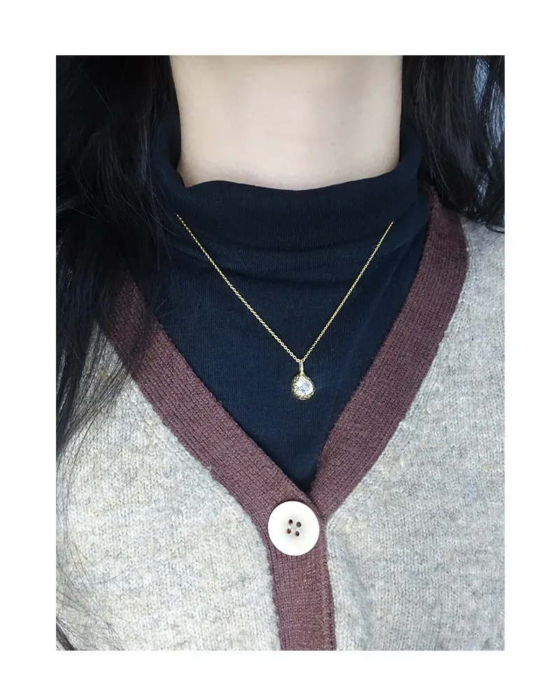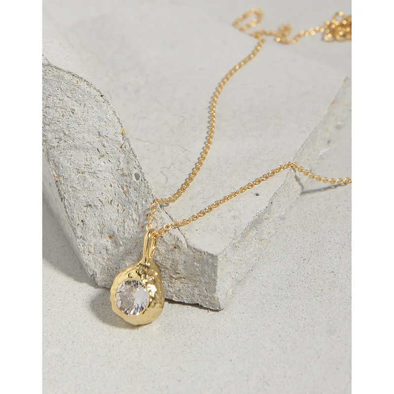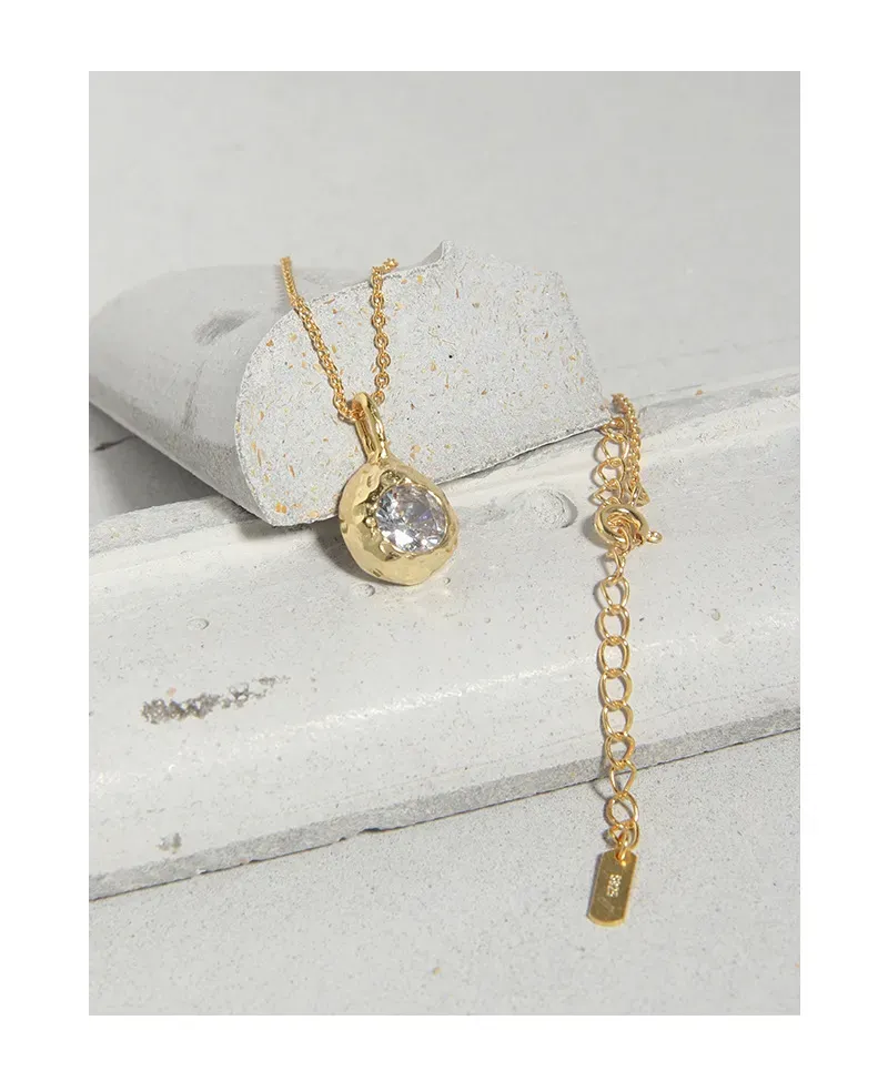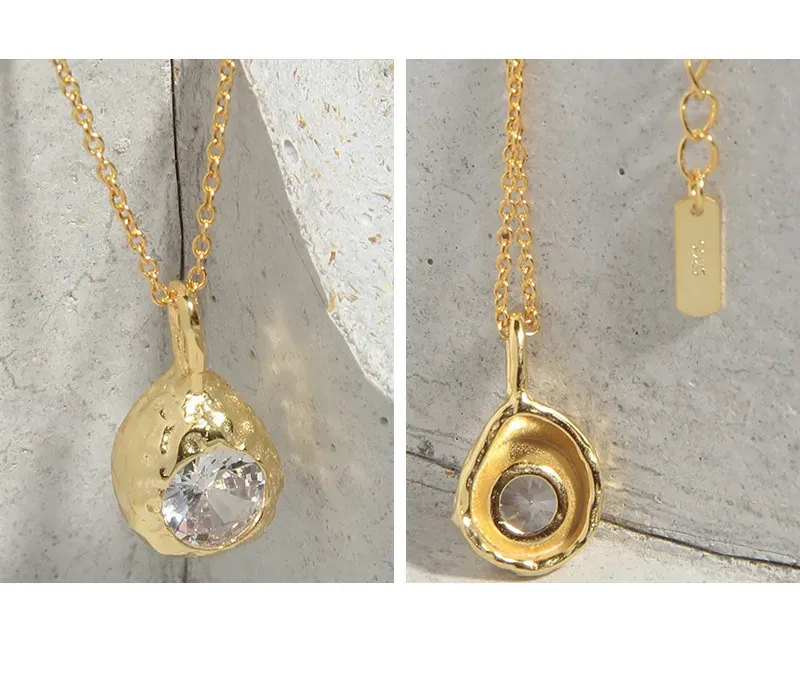 • Patterns or Textures: The pendant boasts an irregular, hammered, or molten texture, reflecting the ‘imperfect beauty of nature’s patterns.’ An oval, faceted clear crystal is artfully embedded within this raw gold form, evoking a precious gem unearthed from the earth. The fine chain comprises delicate, uniform links, ensuring a graceful flow and subtle shimmer.