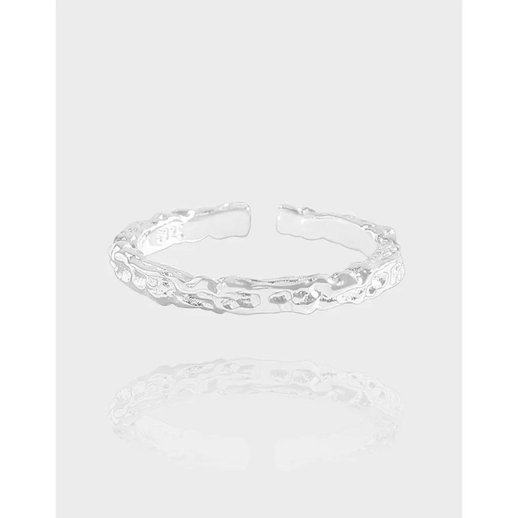 This ring shines with a luminous silver finish, casting a subtle, celestial glow reminiscent of the aurora’s shimmer or moonlight on water. Its adjustable, open-end design offers a fluid form, embodying the natural grace and adaptable beauty celebrated by Malisse.
