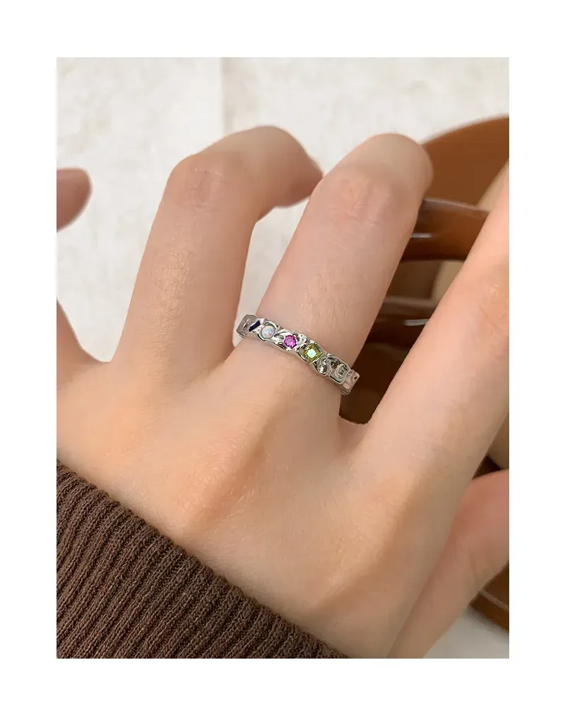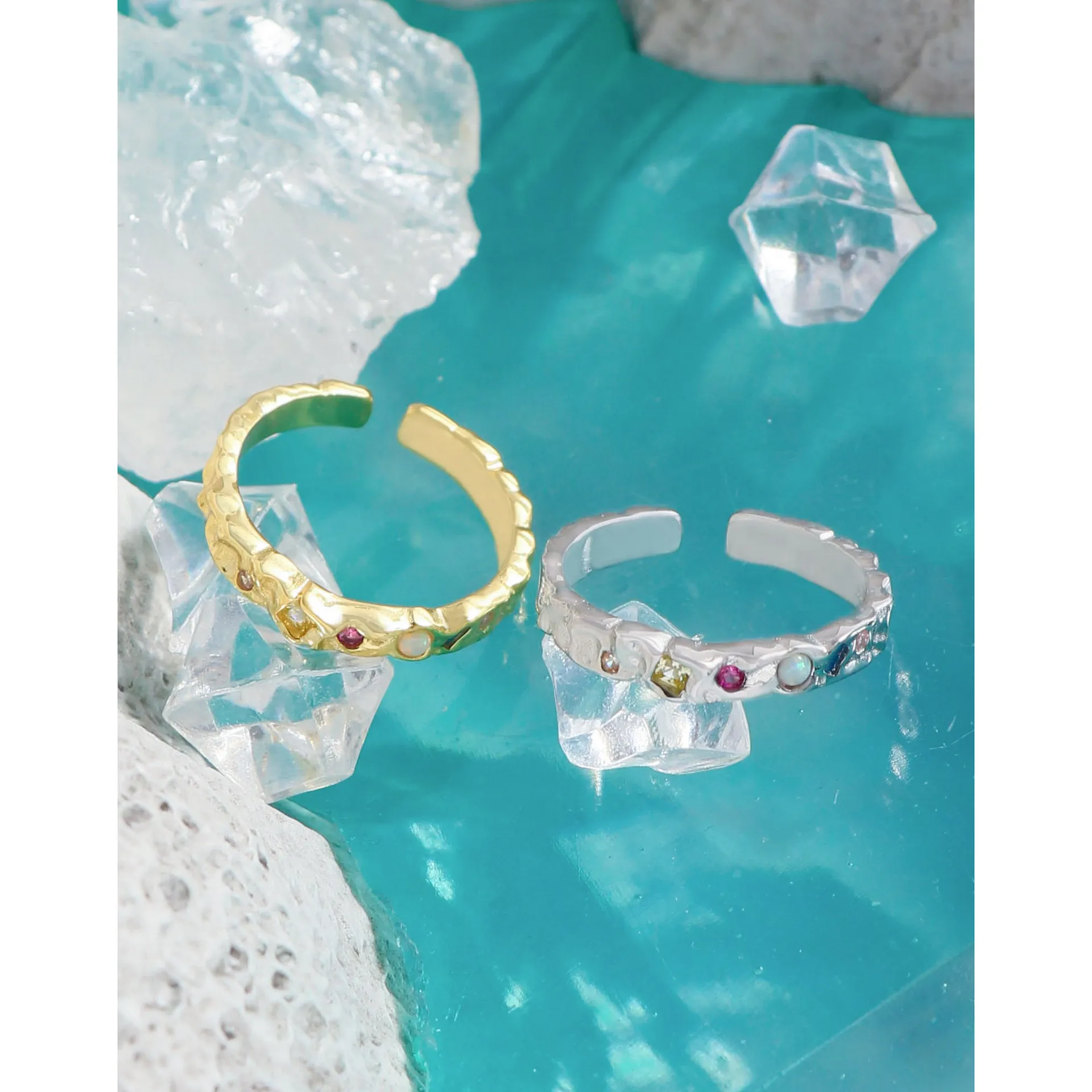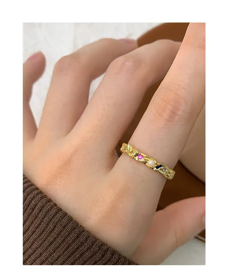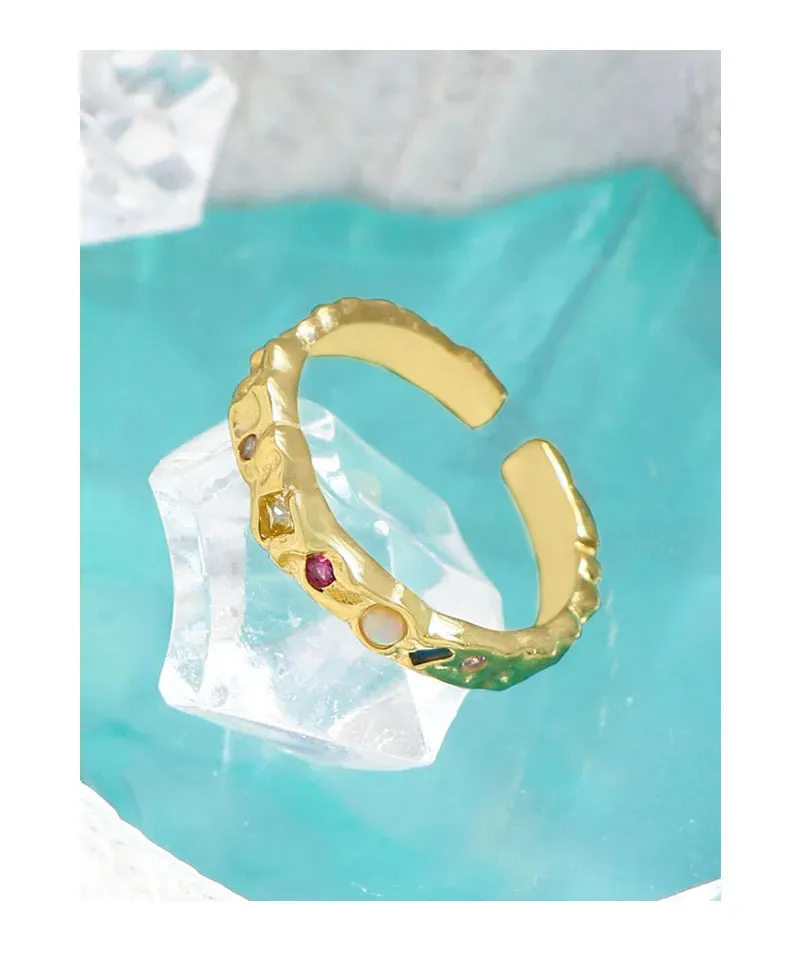• Color: The Finoria Ring showcases a radiant gold hue, beautifully contrasted with an array of irregularly placed gemstones. These include an iridescent opalescent stone, a captivating deep blue gem, a vibrant fuchsia-toned stone, and a sparkling pale yellow or clear gem, evoking the diverse and enchanting palette of the natural world.