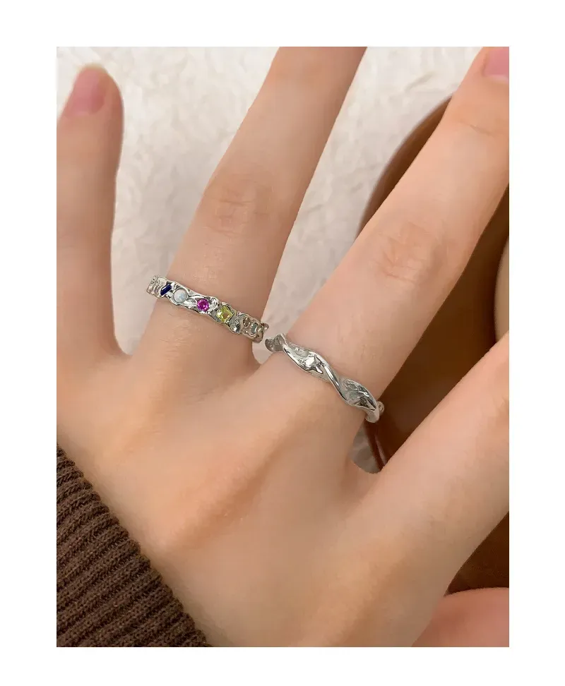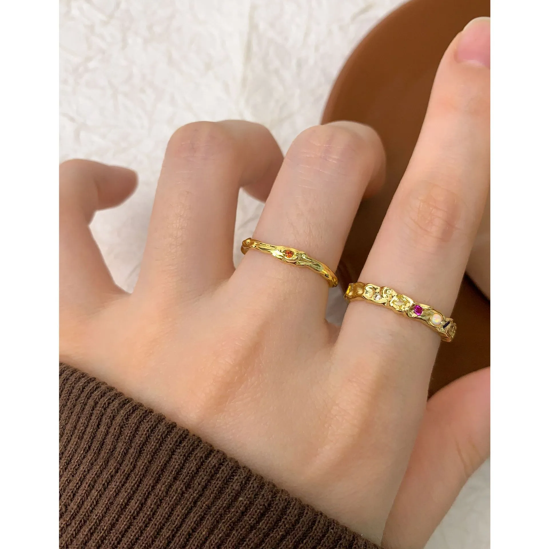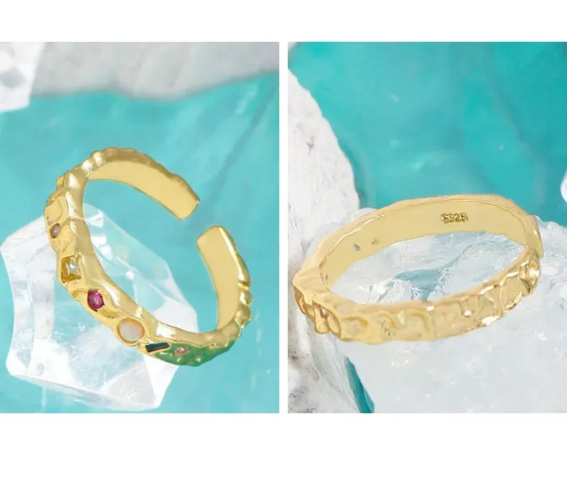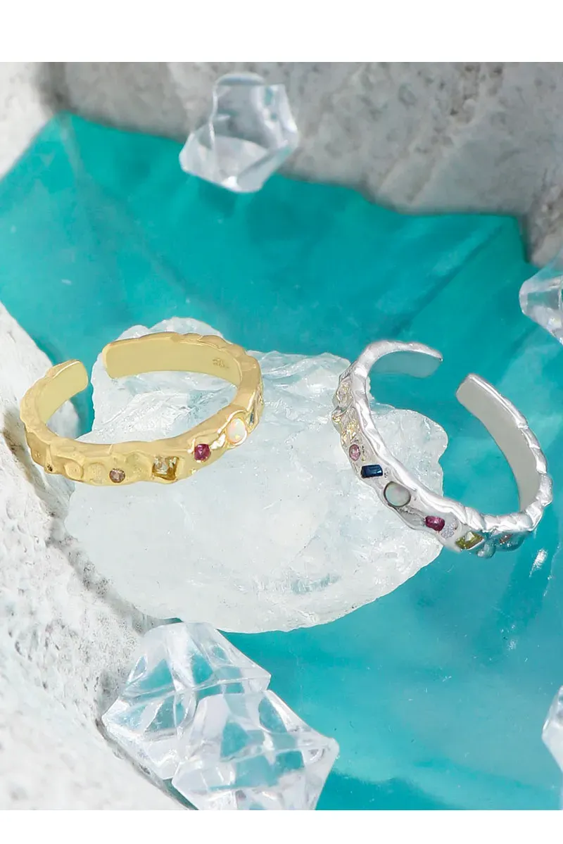 • Patterns or Textures: The gold band features a distinctive, uneven, and textured surface, reminiscent of natural rock formations or a hand-hammered finish. This “imperfect beauty” provides a tactile, earthy feel. The varied shapes and random placement of the multi-colored gemstones further enhance its organic charm, mirroring the unique patterns found in celestial and terrestrial landscapes.