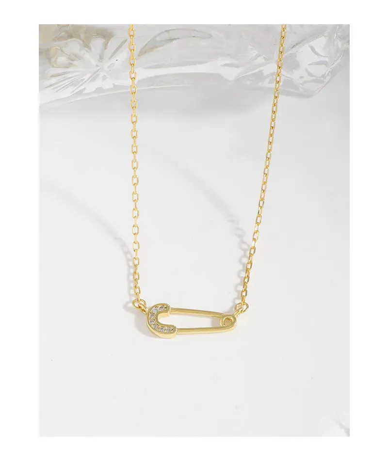 - Color: The Fioren Necklace features a brilliant golden hue throughout its delicate chain and contemporary safety pin pendant. A segment of the pendant is adorned with an array of clear, sparkling stones, offering a luminous contrast and celestial shimmer.