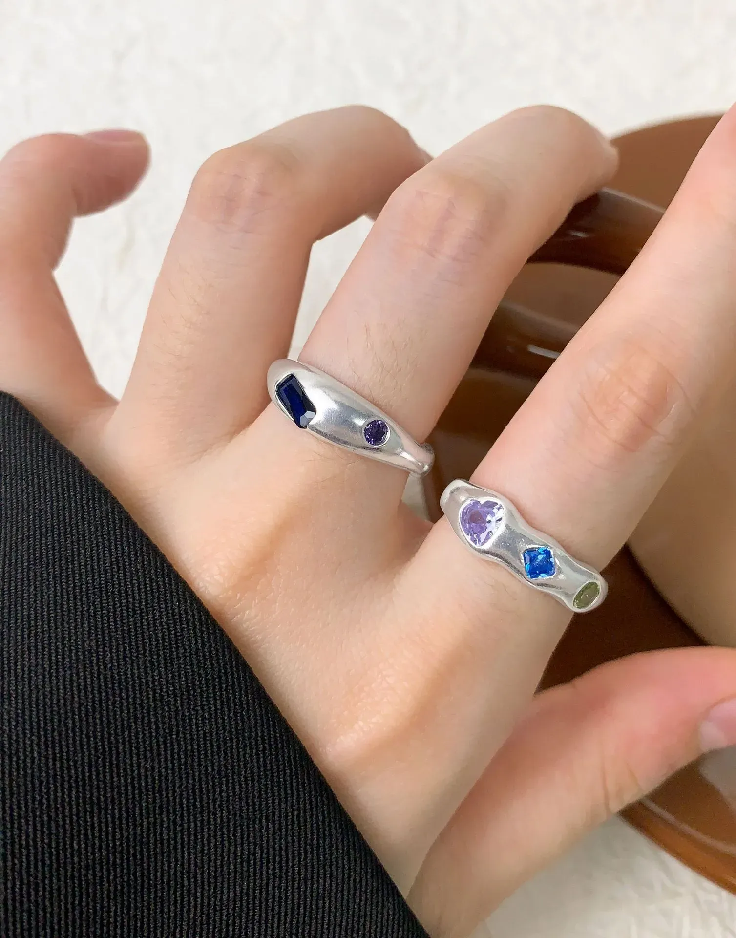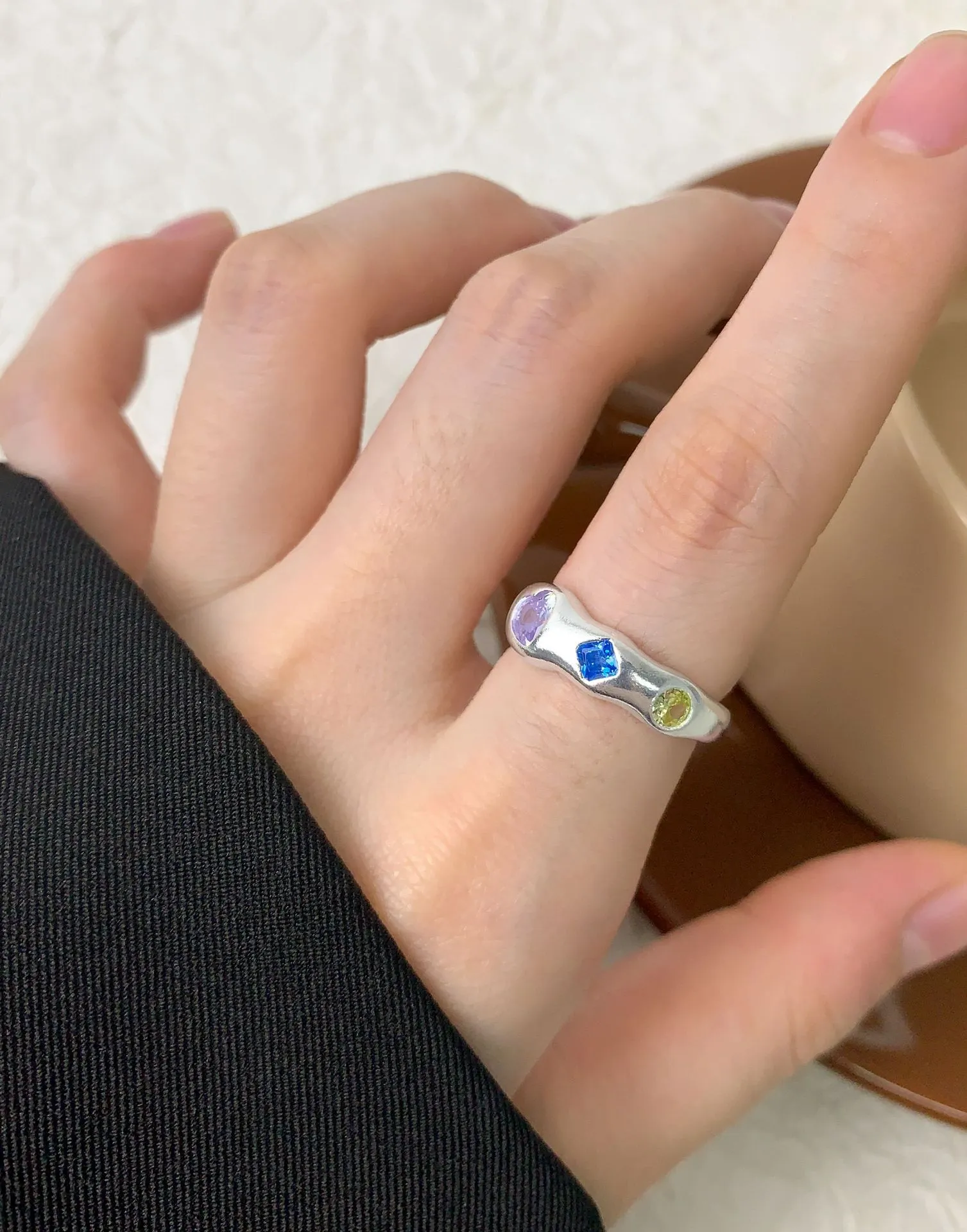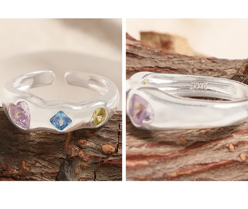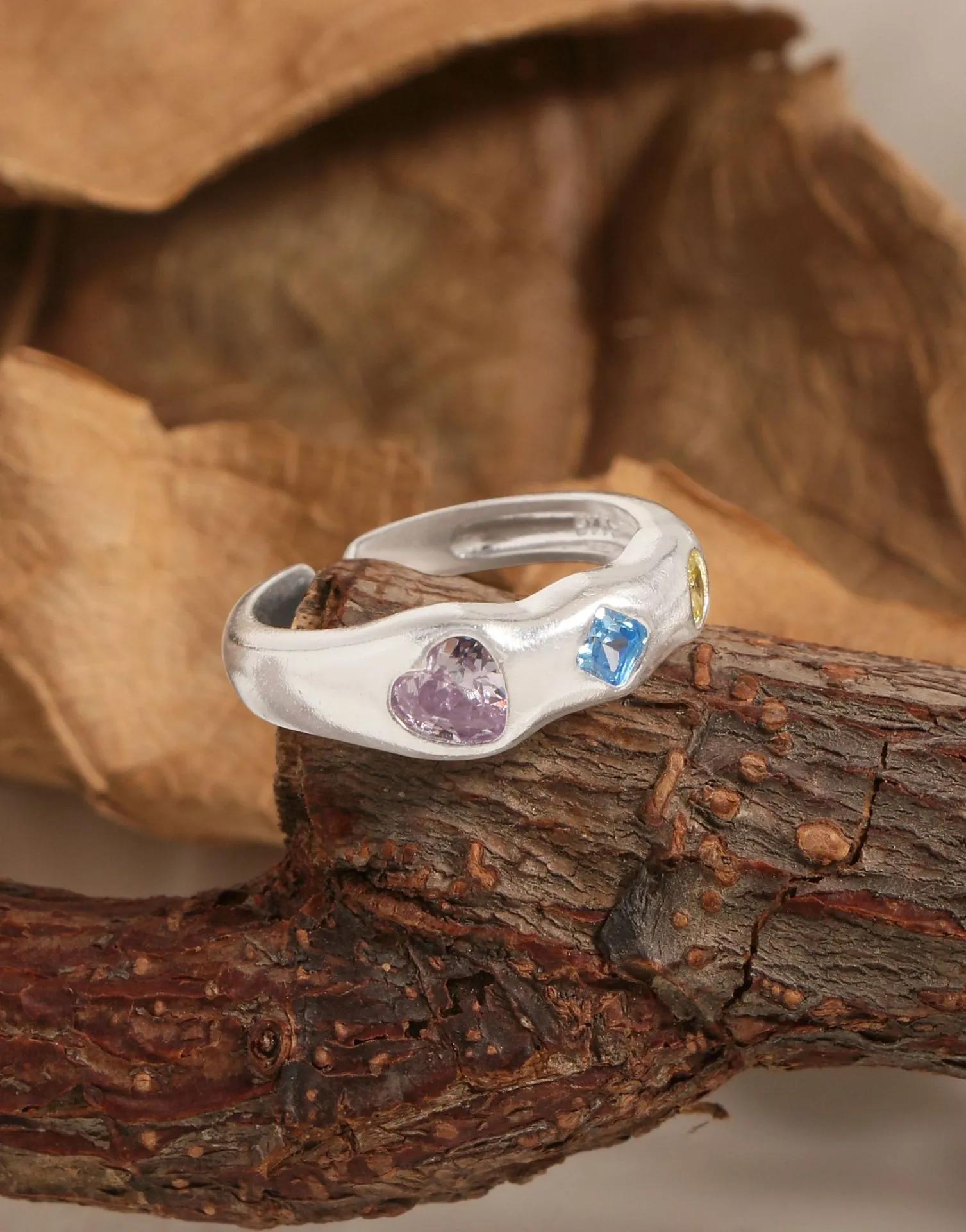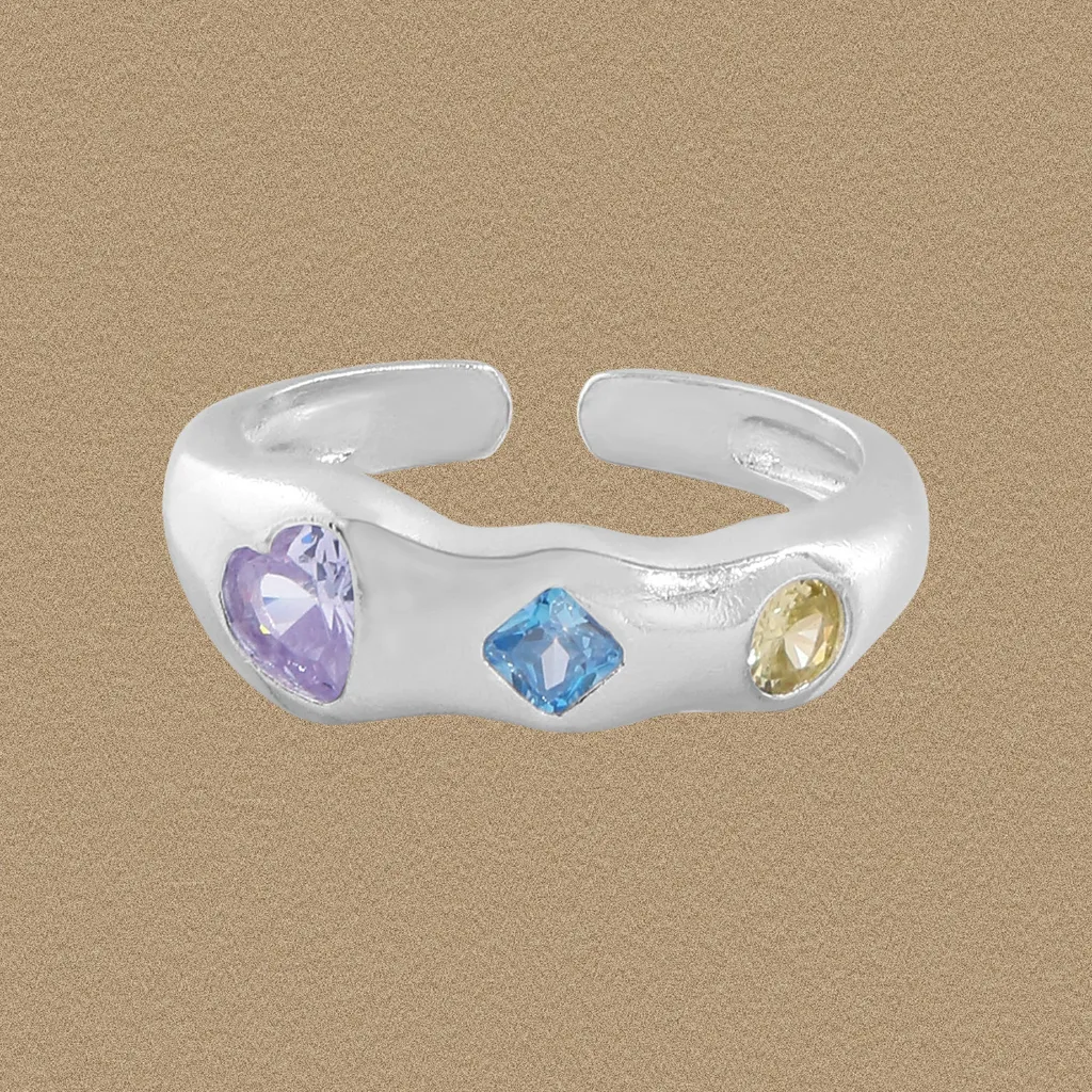 Immerse yourself in cosmic wonder with the Malisse Celestial Flow Gemstone Ring. This captivating piece features a radiant silver band, beautifully complemented by three distinct gemstones: a captivating heart-shaped purple stone, a vibrant square blue stone, and a sunny oval yellow stone, embodying celestial hues.