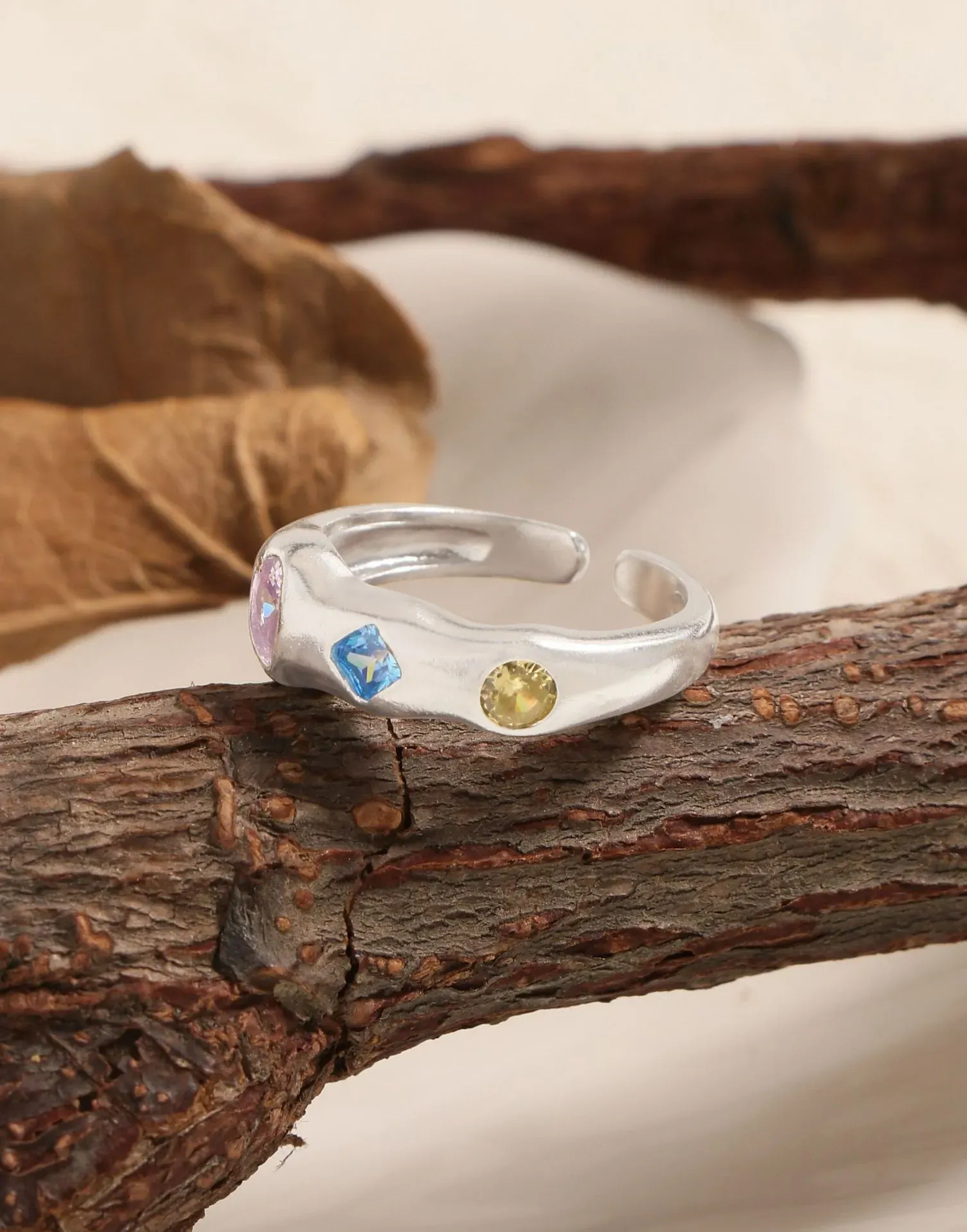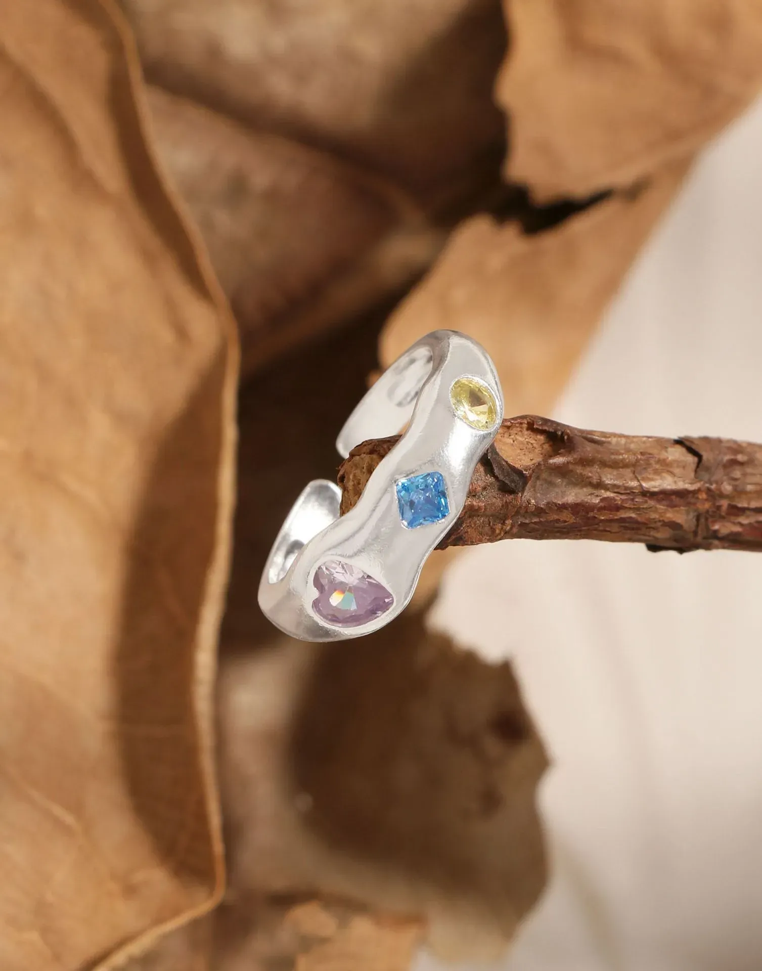 Designed with an open-ended, adjustable fit, this chunky ring showcases a fluid and organic silhouette, reflecting a modern yet timeless elegance. The silver band boasts a unique, subtly undulating texture, giving it a raw, imperfect charm reminiscent of nature’s artistry. Each gemstone is expertly faceted, creating a dazzling play of light and adding a captivating depth to the piece, captuFisayana Ring the essence of earth, sky, and light.