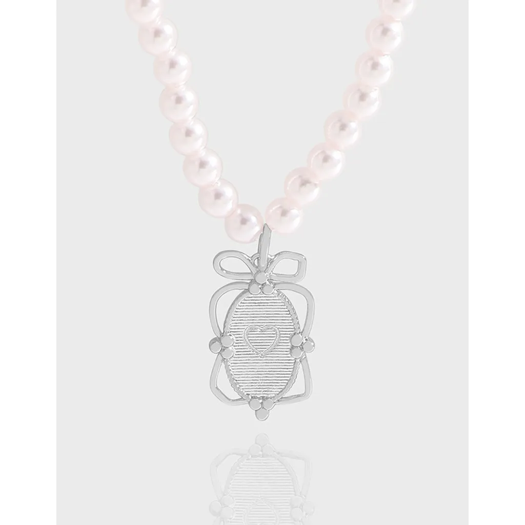 - Patterns or Textures: The necklace showcases perfectly spherical pearls, each with a smooth, radiant luster. The silver pendant features a finely detailed oval center with horizontal ridged textures, beautifully contrasted by a smooth, subtly raised heart at its core. Delicate beaded accents adorn the sides of the pendant, which is crowned by a charming, smooth bow, adding to its intricate appeal.