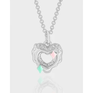 Crafted from radiant, polished silver, the Gaelunara Necklace features a brilliant metallic sheen. The heart pendant is delicately adorned with two small, diamond-shaped accents: one in a captivating pastel pink and another in a serene mint green. These “celestial hues” evoke the magical glow of the northern lights, adding a touch of gentle color and whimsical charm.