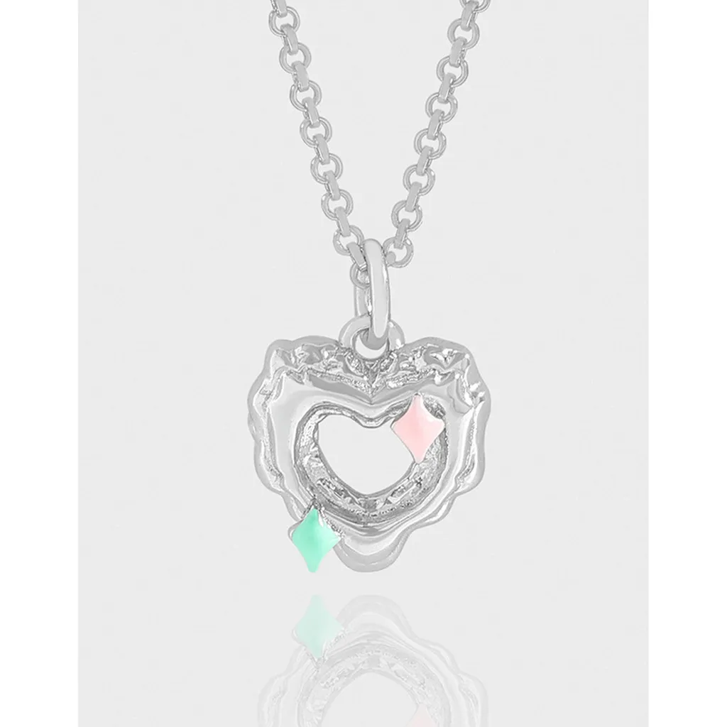 The most striking feature is the heart-shaped pendant’s distinctively irregular and wavy edges, giving it an organic, almost ‘melted’ texture that celebrates the “imperfect beauty of nature’s patterns.” This contrasts beautifully with the smooth, polished surface of the silver, which reflects light to create a delicate shimmer. The small diamond accents also have a smooth, lustrous finish, completing the piece’s harmonious balance of raw textures and refined elements.