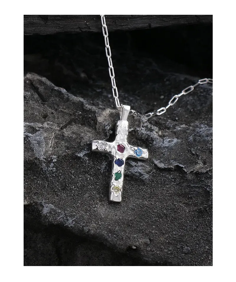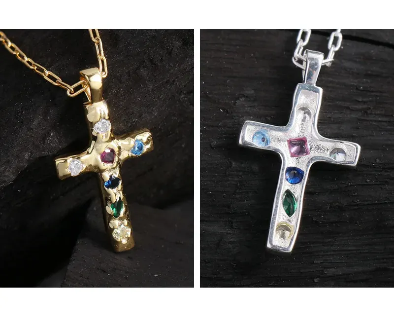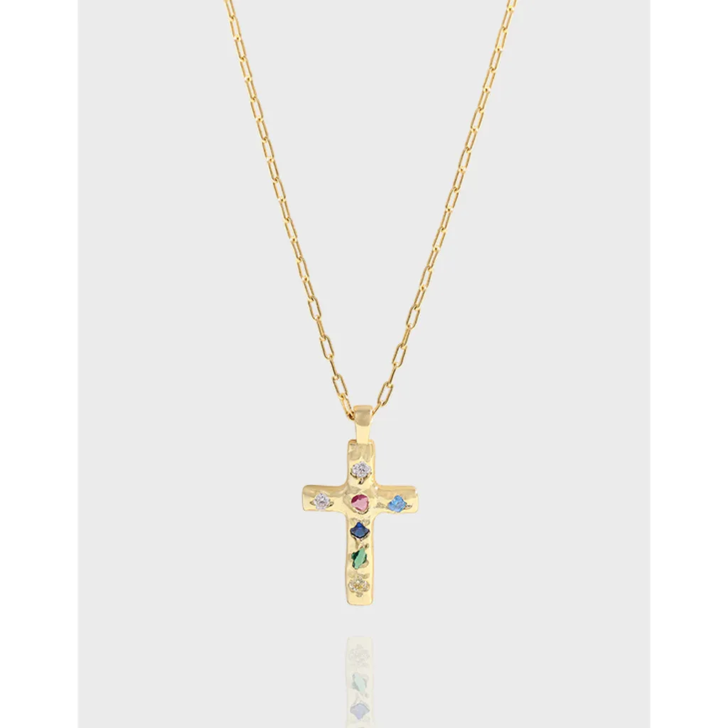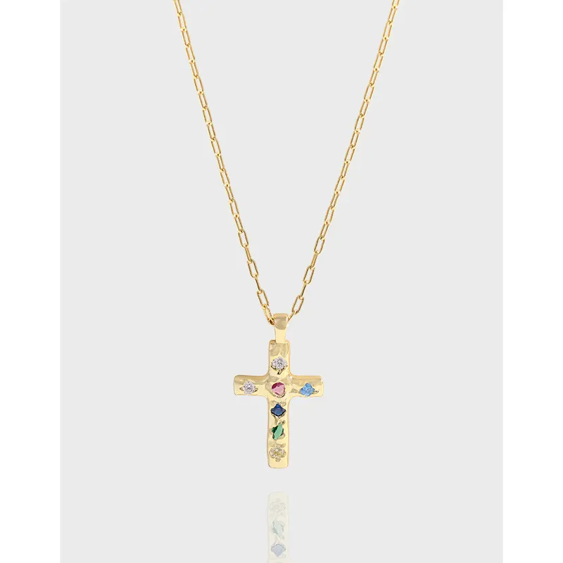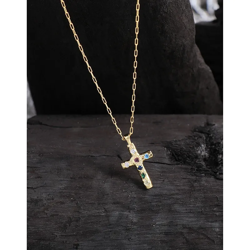 - Patterns & Textures: The cross pendant features a distinctly organic, hand-hammered texture, giving each piece a unique and raw character, echoing the imperfect beauty found in nature. The colorful gemstones are faceted, adding a brilliant shimmer against the rich, textured gold, while the chain’s rectangular links offer a subtle, modern pattern.