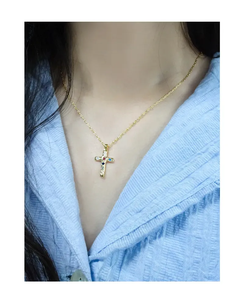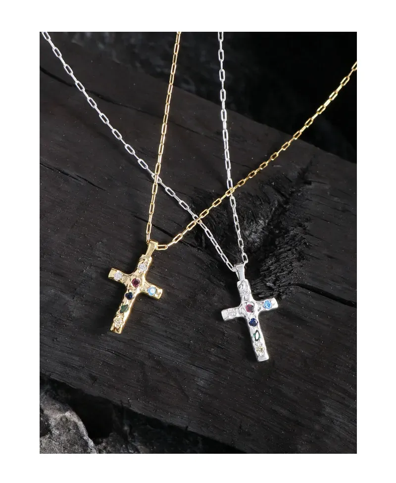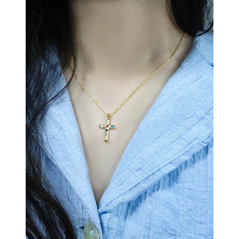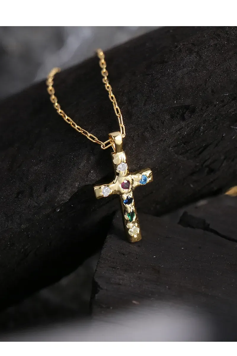 - Patterns & Textures: The cross pendant features a distinctly organic, hand-hammered texture, giving each piece a unique and raw character, echoing the imperfect beauty found in nature. The colorful gemstones are faceted, adding a brilliant shimmer against the rich, textured gold, while the chain’s rectangular links offer a subtle, modern pattern.