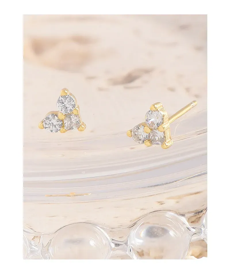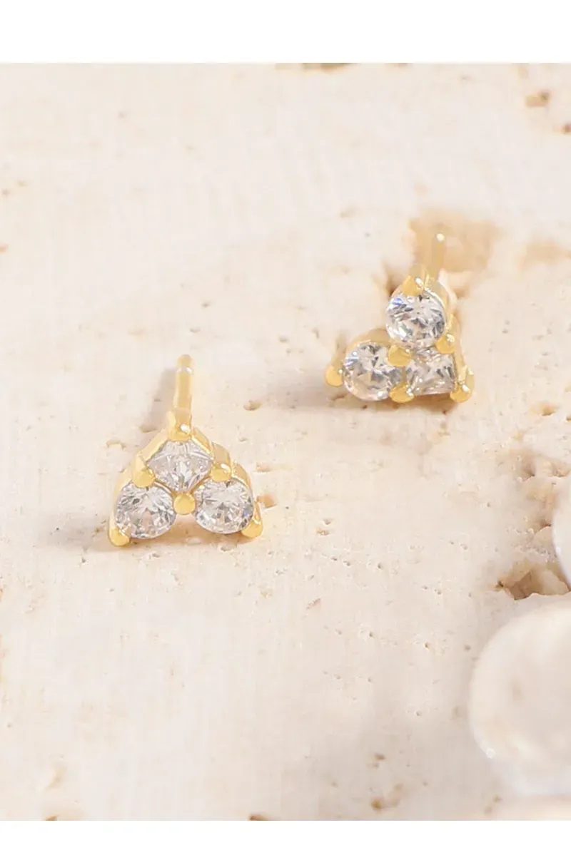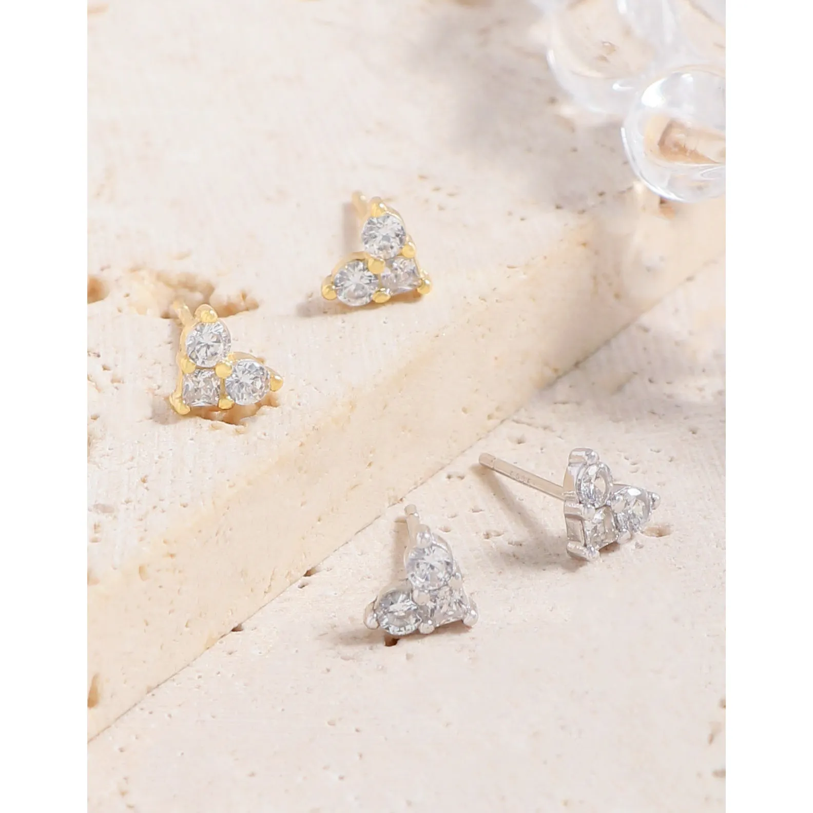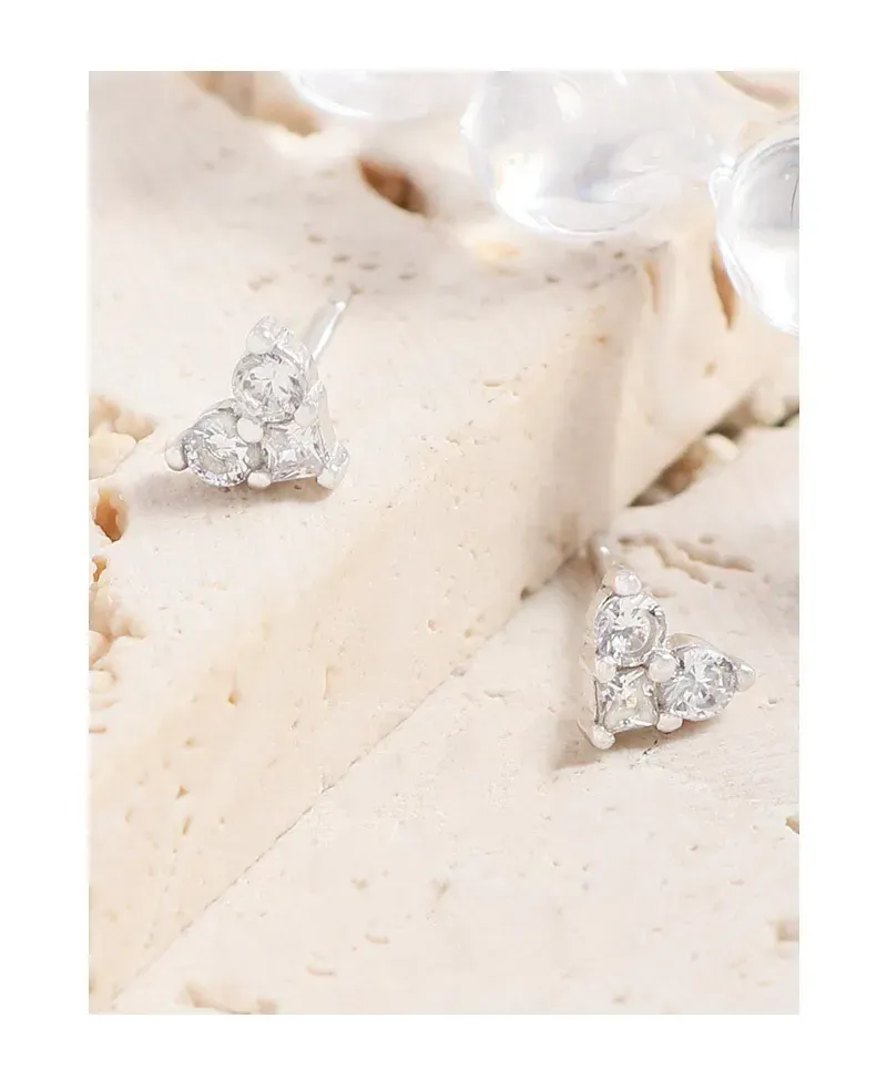 - Each stud showcases three brilliant cubic zirconia stones: two round brilliant-cut stones artfully arranged above a single, radiant princess-cut stone.