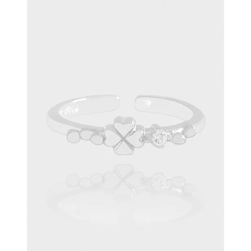 - Patterns & Textures: At its heart lies a graceful four-leaf clover, symbolizing luck, flanked by smoothly polished circular accents along the band. A prominent, faceted clear crystal catches the light brilliantly, contrasting with the sleek, polished texture of the silver metal.