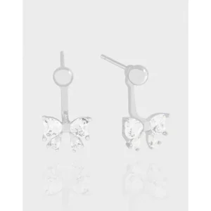Featuring a smooth, polished texture on the silver-tone metal, the Georgina Earrings provide a sleek contrast to the multifaceted brilliance of the clear stones. The bow pattern is intricately formed by larger pear-shaped stones for the “loops,” centered by a smaller stone, while two additional pear-shaped stones dangle below, mimicking the fluid elegance of celestial ribbons.