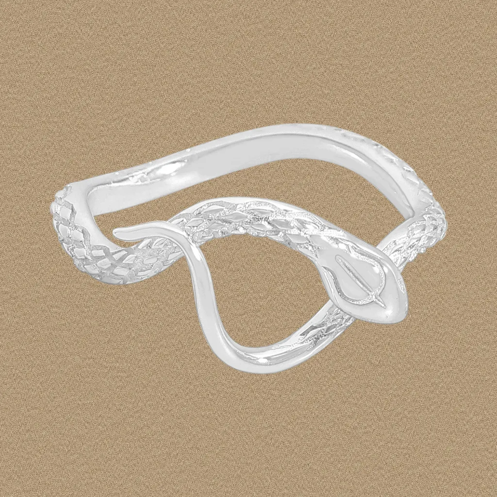 The ring showcases a captivating interplay of textures. Portions of the serpent’s body are meticulously detailed with a delicate, scale-like pattern, evoking the raw beauty of natural forms. These intricate textures beautifully contrast with the smoothly polished sections, which shimmer with a soft, lustrous sheen, highlighting the ring’s dynamic curves. The serpent’s head is artfully sculpted, featuring an etched design that adds a touch of mystery and timeless allure to this unique piece.