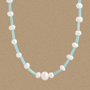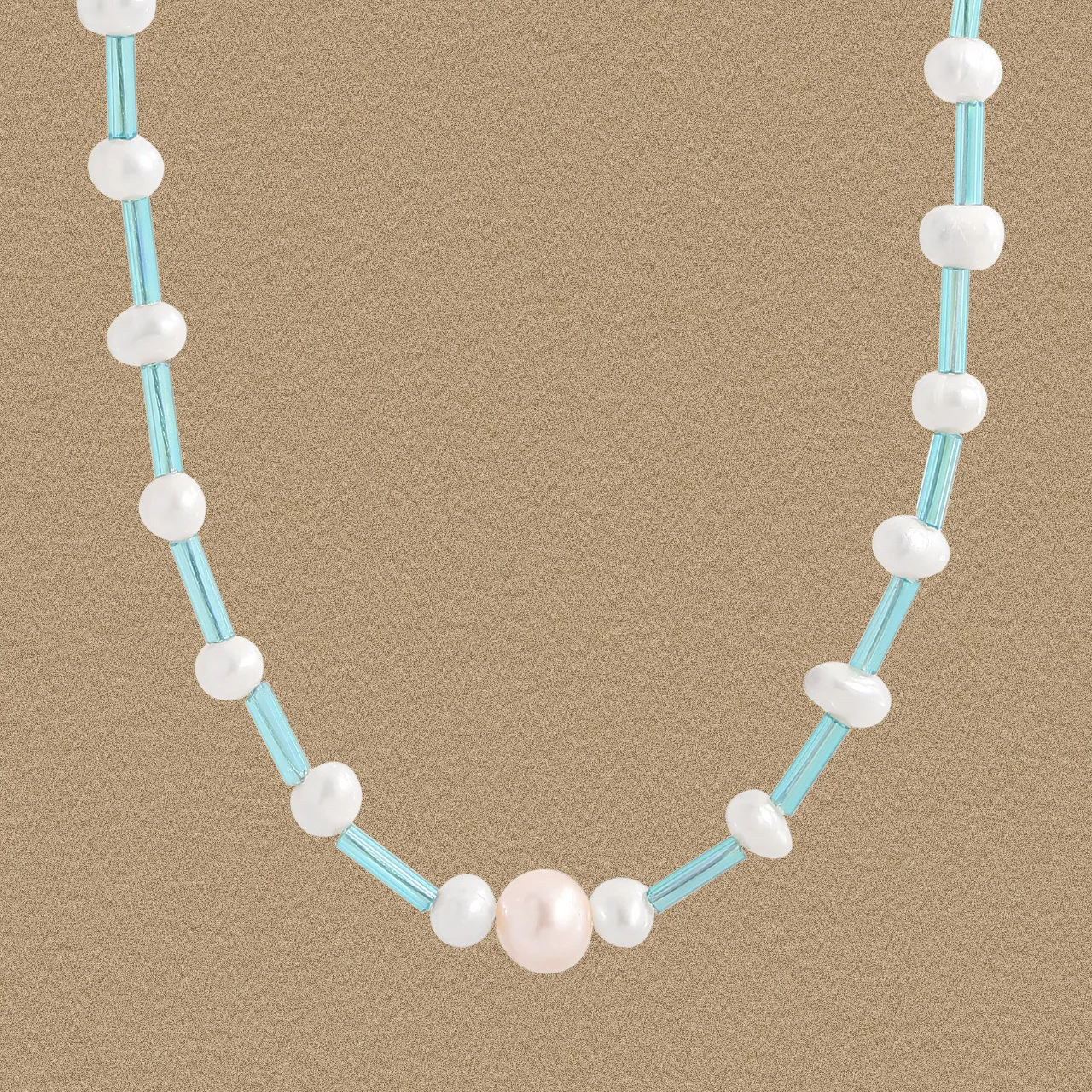 - **Color:** Featuring a delicate palette inspired by the cosmos, this Gralyssa Necklace showcases luminous white and cream pearls, beautifully accented by a singular, captivating blush pink pearl at its heart. These organic gems are interspersed with serene aqua blue glass beads, reminiscent of clear waters or a boundless sky.