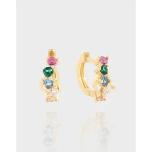 The smooth, polished texture of the gold metal provides a luminous backdrop, allowing the radiant, multi-faceted gemstones to shimmer with an ethereal glow. Their comfortable huggie style offers a snug and elegant fit, reflecting the magic and fluid artistry Malisse is known for.