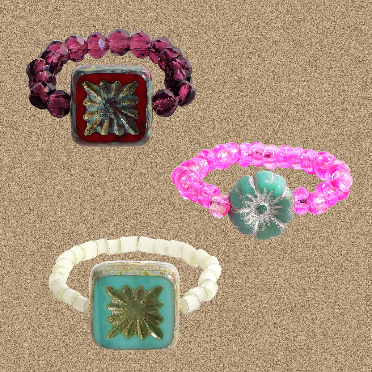 • Patterns & Textures: The heart of each ring is a distinctive central bead, either a smooth-edged square or a charming fluted sphere. Adorning these focal points is an intricate, raised starburst or floral motif, often finished with a subtle metallic patina, suggesting ancient craft and celestial shimmer. The beaded bands feature a delightful mix of textures, from sparkling faceted beads to smooth, rounded, or subtly rectangular forms, creating a tactile and visually engaging experience.