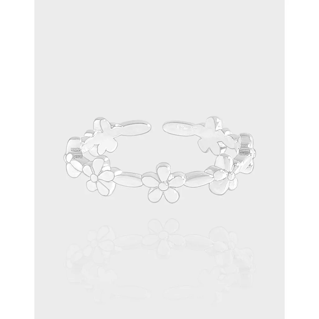 Patterns & Textures: A continuous pattern of charming small flowers encircles the band, each blossom intricately detailed with soft petals and a subtle center. The smooth, polished texture of the silver accentuates these organic shapes, creating a tactile experience that is both refined and connected to the earth’s artistry.