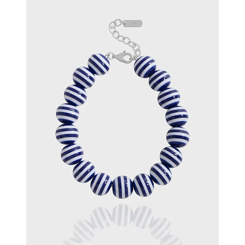This charming bracelet features smooth, spherical beads in a striking combination of deep navy blue and crisp white. Each bead is adorned with horizontal stripes, creating a playful yet classic pattern.