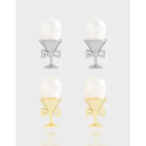 The unique design showcases a smooth, polished metal ‘martini glass’ silhouette, complete with a charming decorative bow adorning its stem. The refined finish of the metal setting creates a beautiful contrast with the natural luster and gentle texture of the pearl.
