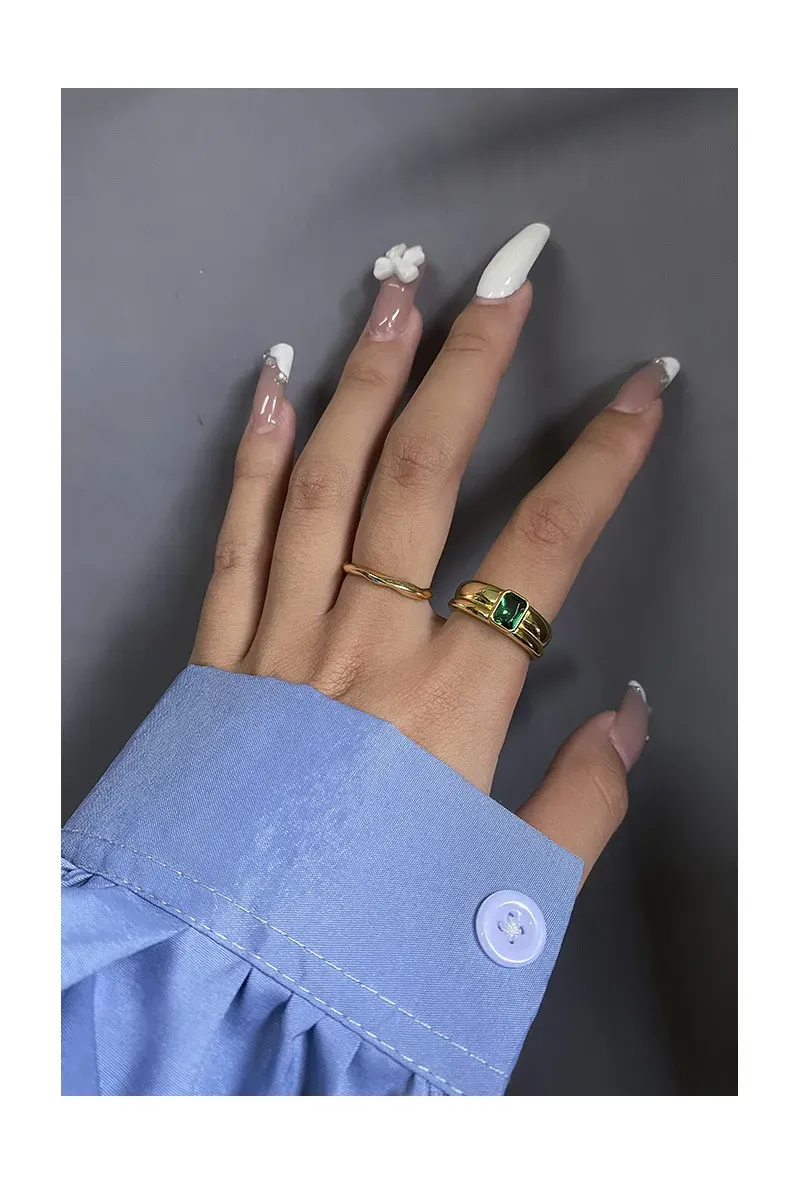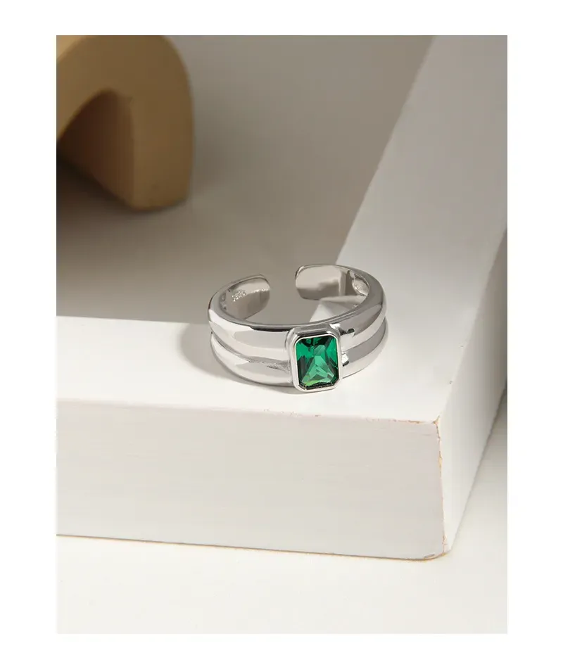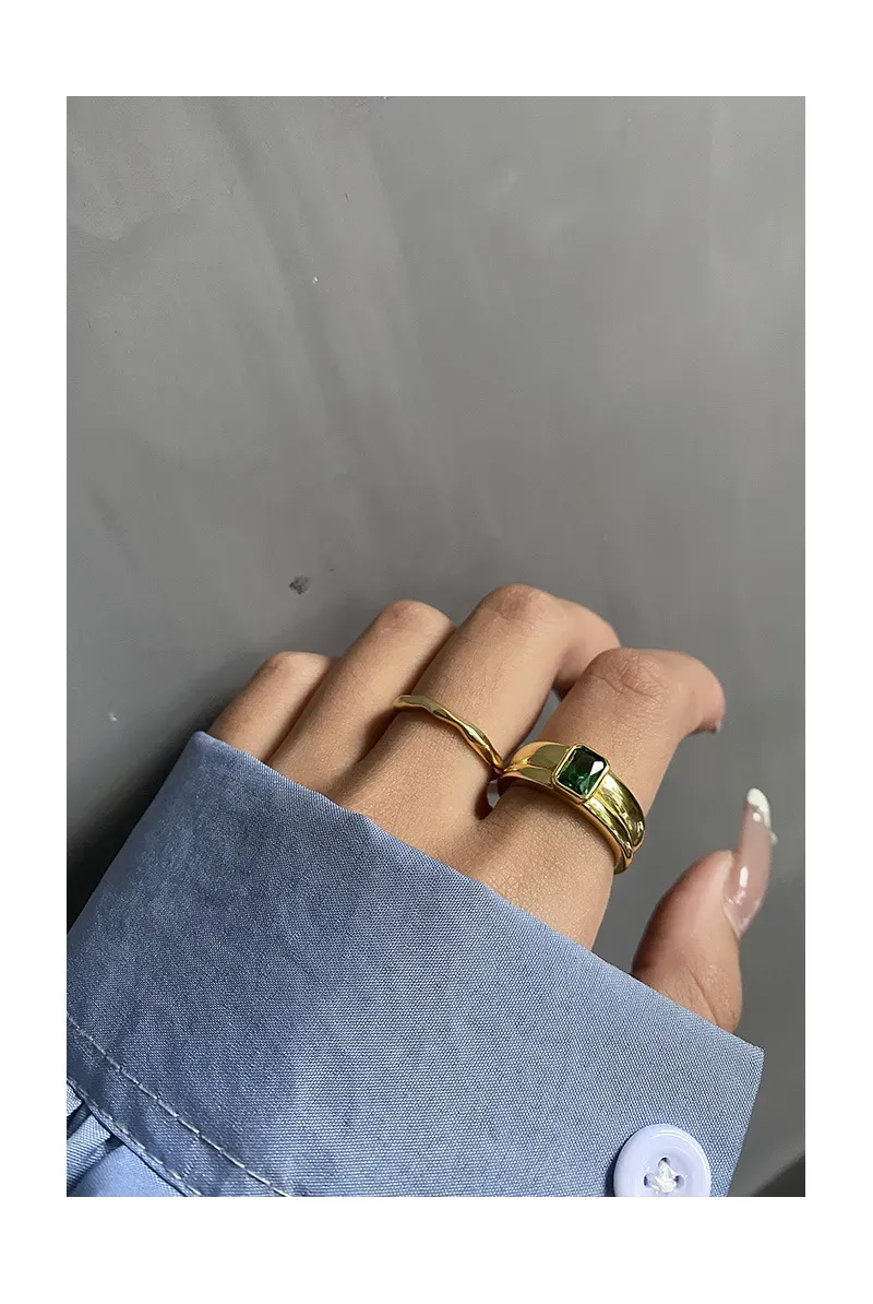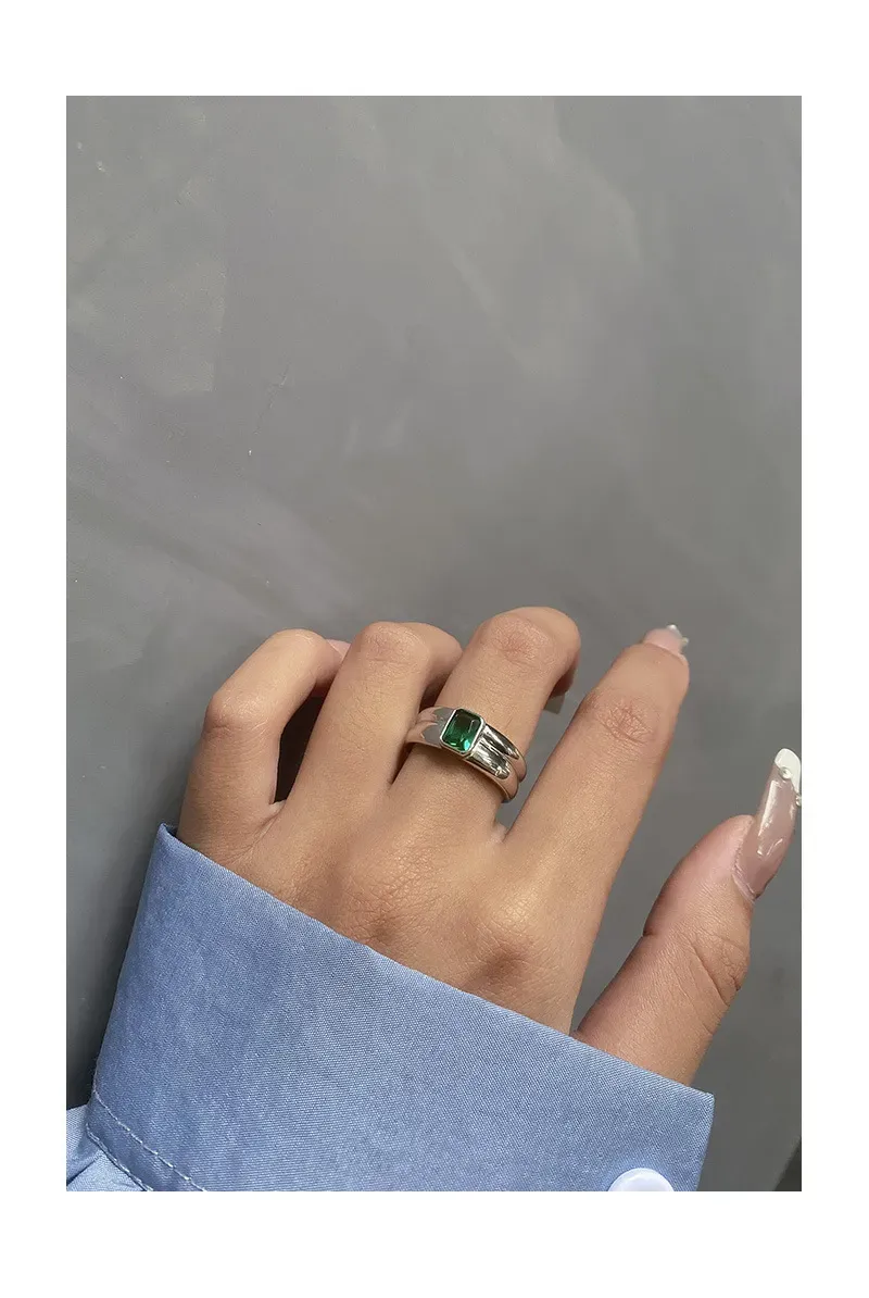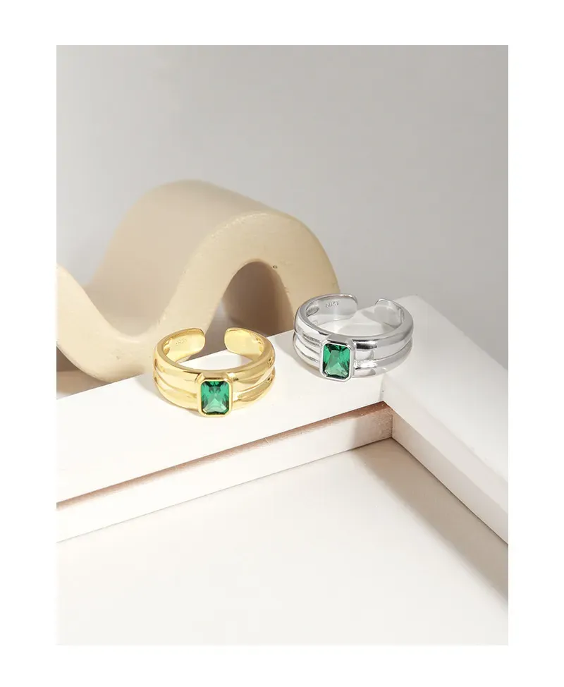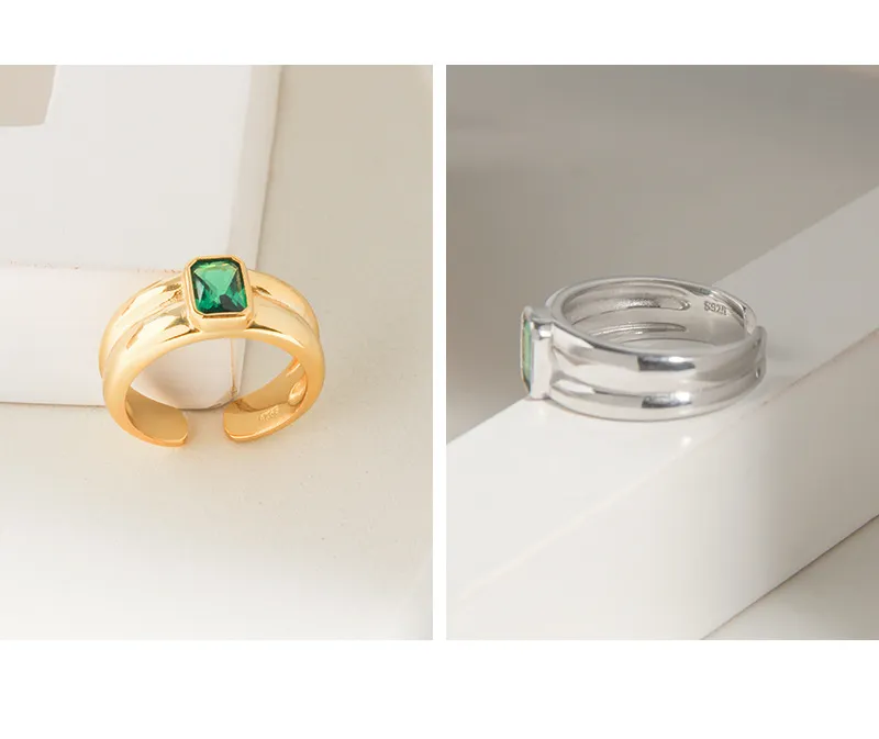 • Patterns or Textures: The smooth, high-polish gold surface gleams with a liquid-like fluidity, subtly accented by a horizontal groove along the band. The rectangular emerald gemstone’s deep facets provide a brilliant sparkle and textural depth, while a discreet ‘S925’ stamp inside confirms its quality.