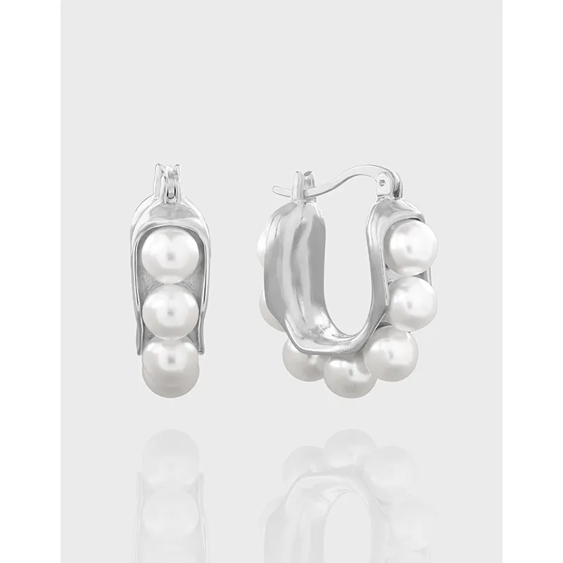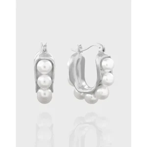 - Style: A modern and sophisticated take on the hoop earring, featuring an organic, curved silhouette. The design gracefully nestles pearls within the frame, with one earring presenting three pearls aligned like a delicate pea pod, and the other displaying a harmonious cluster, embodying the unique and imperfect beauty of nature’s patterns.