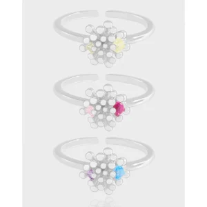The centerpiece features a delicate cluster of finely textured silver spheres, arranged in an imperfect, captivating pattern reminiscent of a blossoming flower or an intricate snowflake. Each Helyndra Ring is uniquely adorned with two vibrant, round gemstones, capturing celestial hues and the depth of natural elements. Available color combinations include shimmering light yellow and sunlit yellow, soft pink and rich magenta, or serene lavender and luminous blue, offering a personalized touch of cosmic beauty.