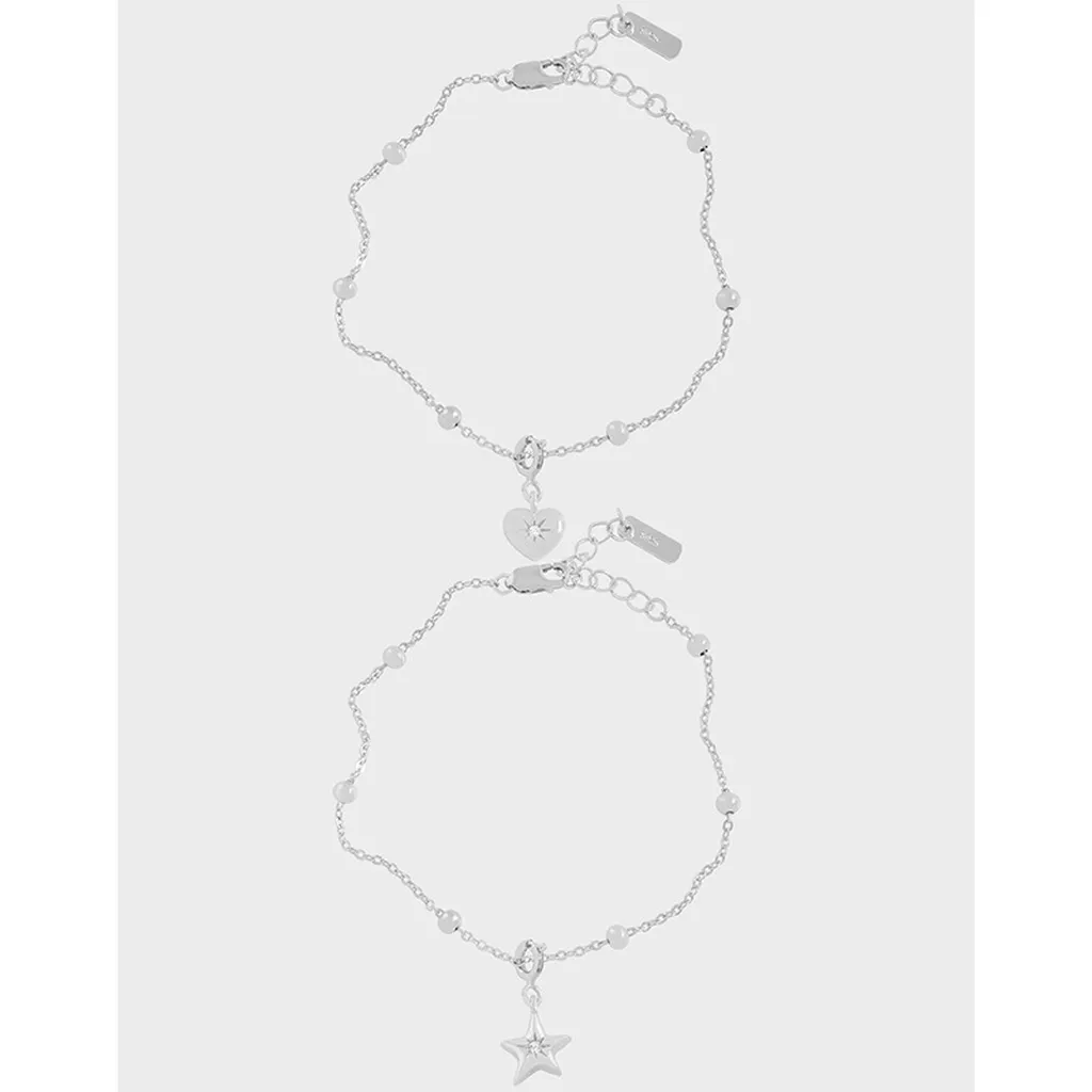 - **Charms:** Each bracelet showcases a distinct charm—either a radiant heart etched with a subtle starburst pattern, or a shimmering five-point star intricately detailed with a central, luminous stone, capturing the “magic and beauty” of the stars themselves.