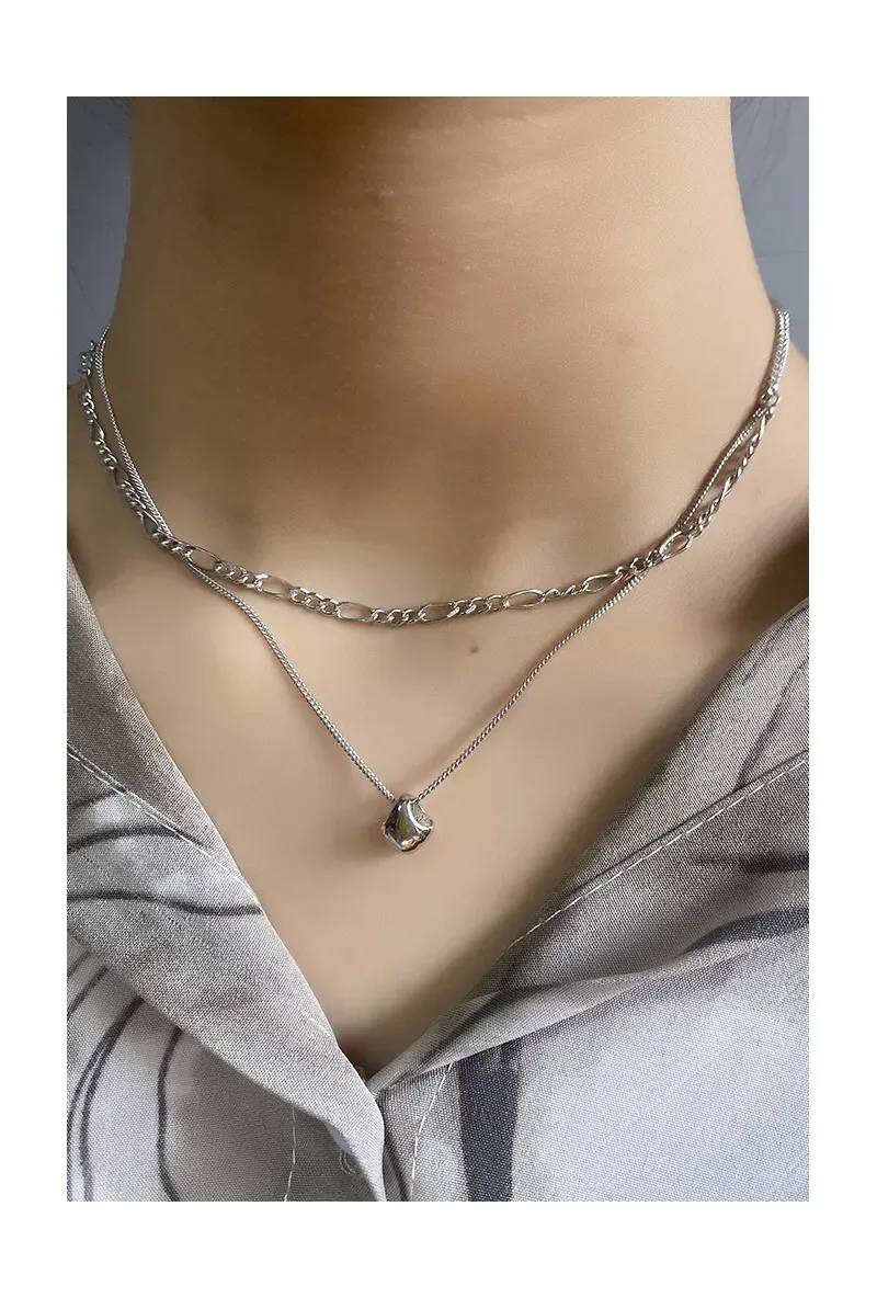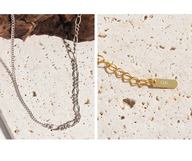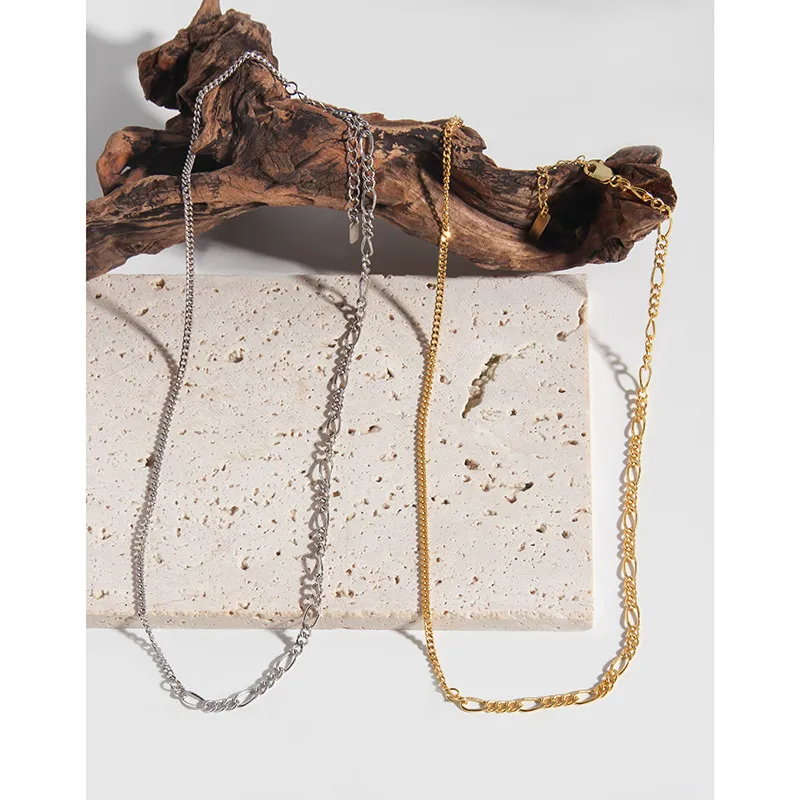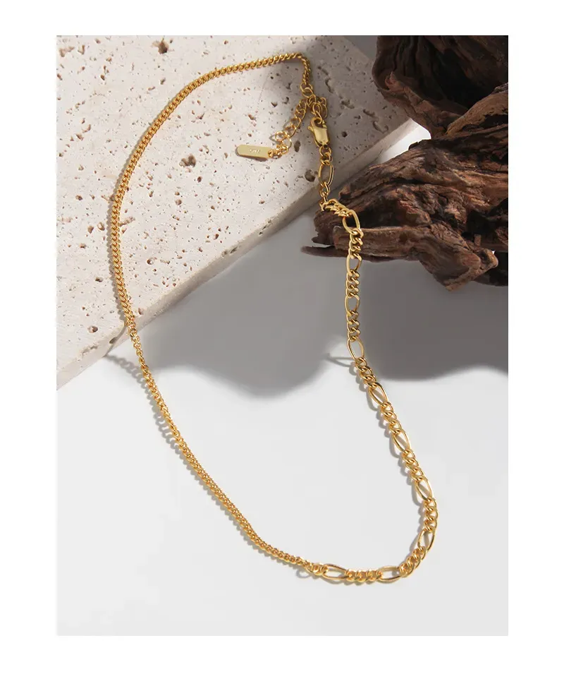 • Patterns & Textures: The Iana Necklace features a deliberate blend of contrasting textures, providing depth and visual interest. One side showcases a delicate curb chain, composed of uniformly linked segments that offer a smooth, continuous texture. The opposing side highlights an elegant figaro chain, characterized by its alternating sequence of three smaller links followed by one elongated oval link, creating a fluid, visually engaging pattern. Each link is meticulously polished to a radiant shine, allowing the golden hue to reflect light with a celestial glow.