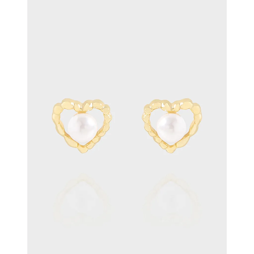 Embrace the enchanting spirit of nature with these Malisse heart-shaped stud earrings. Each piece features a luminous white pearl, exquisitely framed by a radiant gold-tone setting. The frame showcases a unique, organic texture with gently undulating edges, a design choice that embodies the fluid shapes and imperfect beauty of natural elements celebrated by Malisse.