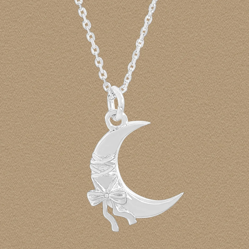 Style: The centerpiece is a graceful crescent moon pendant, artfully designed with fluid shapes that evoke both mystery and serenity. A delicate ribbon elegantly wraps around the moon, culminating in a charming bow at its base, adding a touch of sophisticated grace and unique charm to this celestial design, embodying the fluid and organic essence of nature.