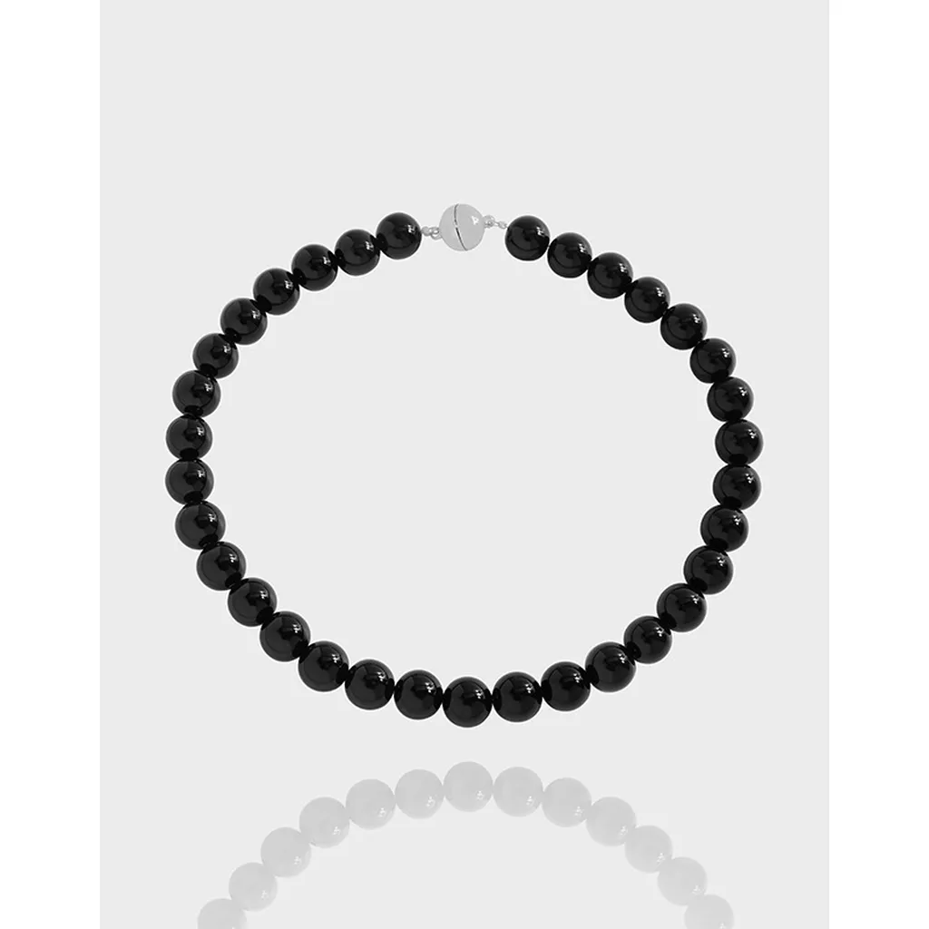 - Color: Features lustrous, deep black spherical beads, reminiscent of obsidian or onyx, perfectly complemented by a sleek, polished silver-tone magnetic clasp.